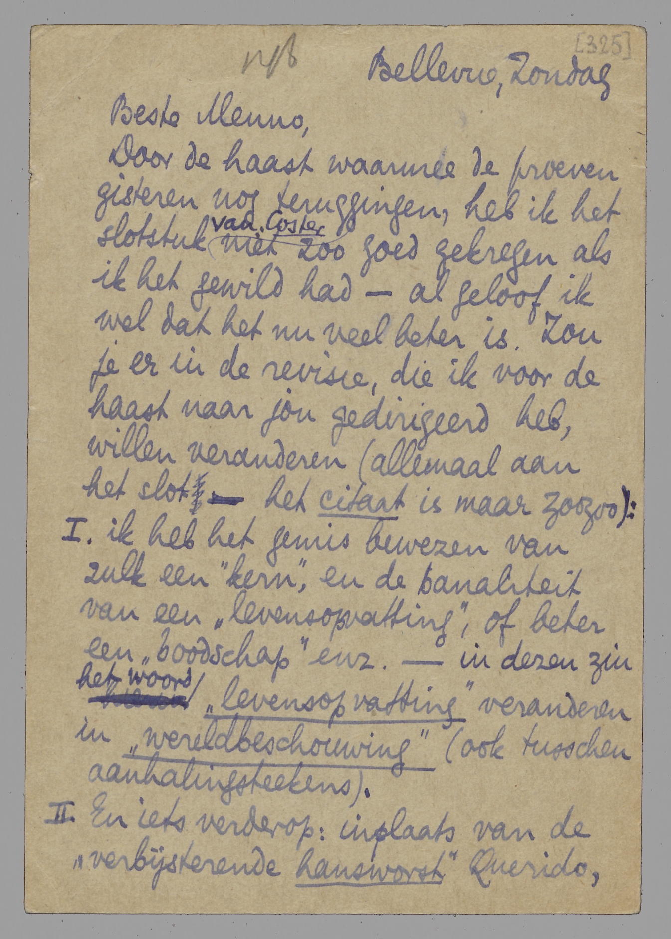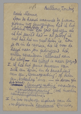 1. ik heb het gemis bewezen van zulk een ‘kern’, en de banaliteit van een ‘levensopvatting’, of beter een ‘boodschap’ enz. - in dezen zin het woord ‘levensopvatting’ veranderen in ‘wereldbeschouwing’ (ook tusschen aanhalingsteekens).
