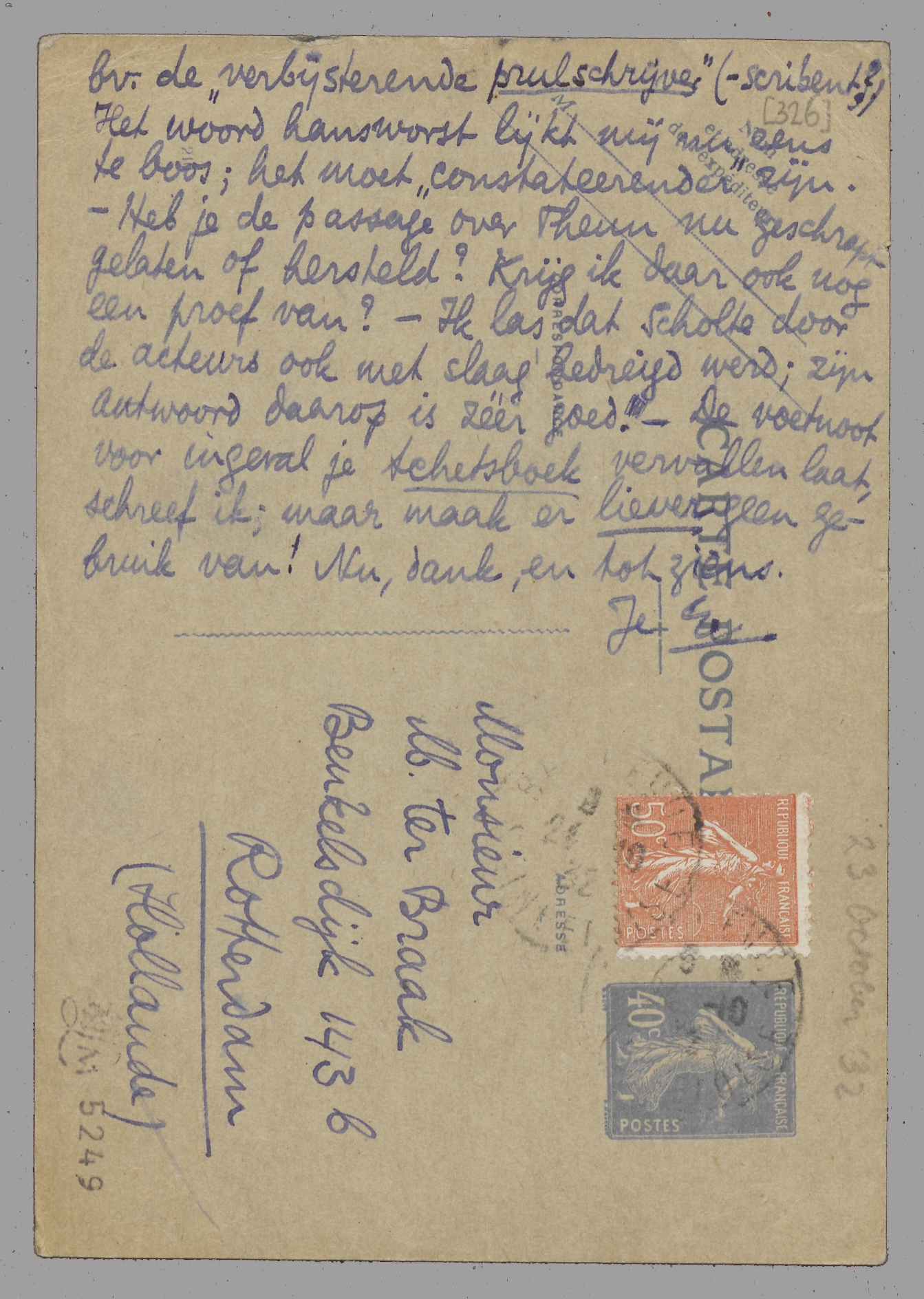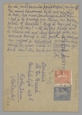 Het woord hansworst lijkt mij nu eens te boos; het moet ‘constateerender’ zijn. - Heb je de passage over Theun nu geschrapt gelaten of hersteld? Krijg ik daar ook nog een proef van? - Ik las dat Scholte door de acteurs ook met slaag bedreigd werd; zijn antwoord daarop is zéér goed. - De voetnoot voor ingeval je Schetsboek vervallen laat, schreef ik; maar maak er liever geen gebruik van! Nu, dank, en tot ziens.