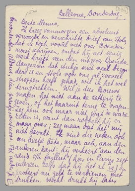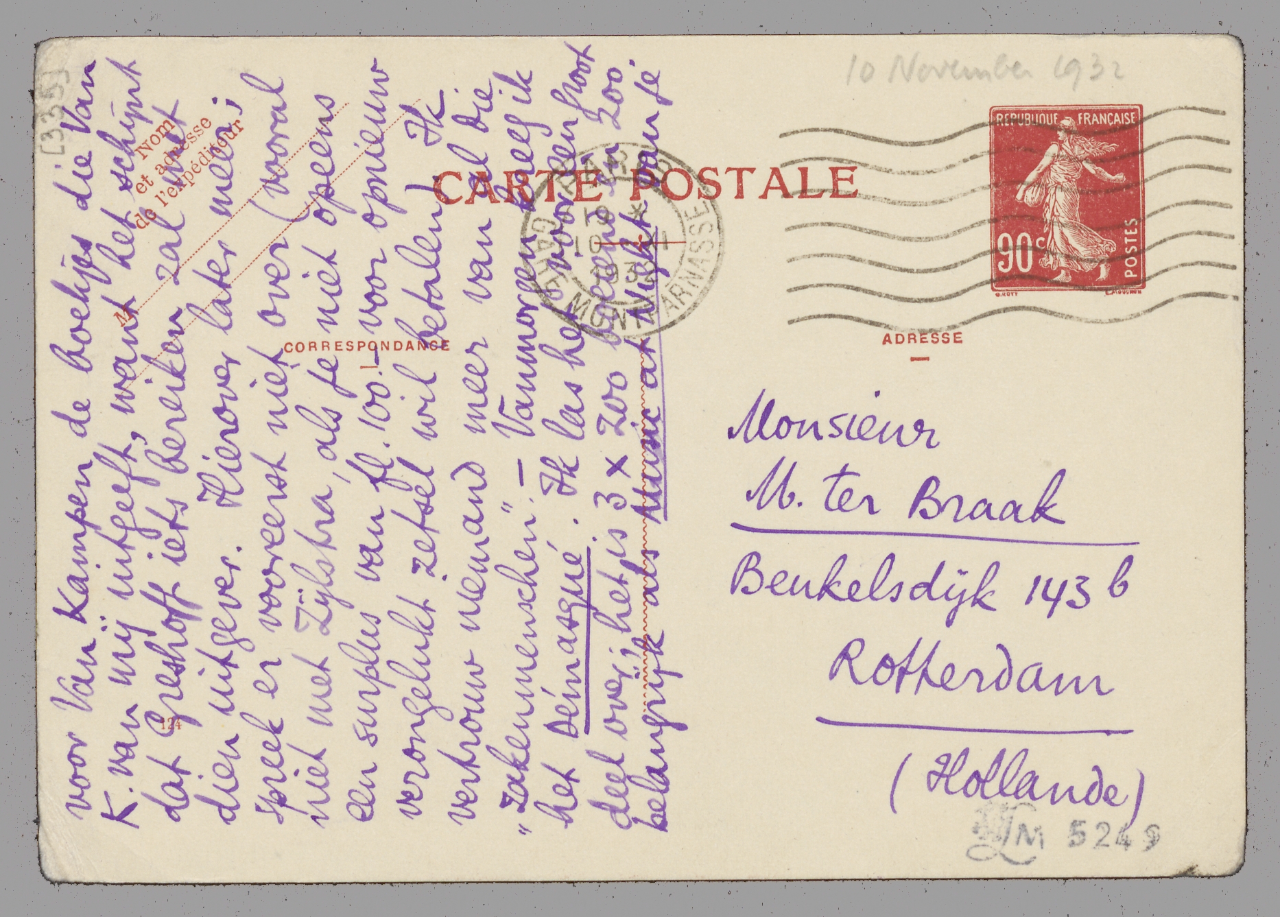 Ik kreeg vanmorgen een absoluut verwarde en verschrikte brief van Stols, dat ik toch vooràl niet over Boender moest schrijven, omdat hij net eenig werk krijgt van den uitgever Querido. Aangezien dat stukje niet veel bizonders is en Stols voor ons al zooveel stroppen heeft gehad, wil ik het wel terugtrekken. Wil je dus Bouws vragen het niet aan de zetterij te geven, of het daaruit terug te vragen. Zeg hem ook maar niet wat de ware reden is, want dan roddelt hij er maar over; zeg maar dat het mij niet bevalt. Ik vind die reden ook een beetje bête, maar ach, aan den anderen kant: hij verkeert ‘aan den rand v/h failliet’ (hier in Parijs zegt iedereen zelfs dat hij het al is) en probeert nu geld te verdienen met drukken. Wschl. drukt hij later voor Van Kampen de boekjes die van K. van mij uitgeeft, want het schijnt dat Greshoff iets bereiken zal met dien uitgever. Hierover later meer; spreek er vooreerst niet over (vooral niet met Zijlstra, als je niet opeens een surplus van ƒ 100.- voor opnieuw verongelukt zetsel wil betalen). Ik vertrouw niemand meer van al die ‘zakenmenschen’. - Vanmorgen kreeg ik het Démasqué. Ik las het voor een groot deel over; het is 3 × zoo boeiend en zoo belangrijk als Music at Night van je bewonderden Aldous, dien praatjesvirtuoos.