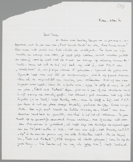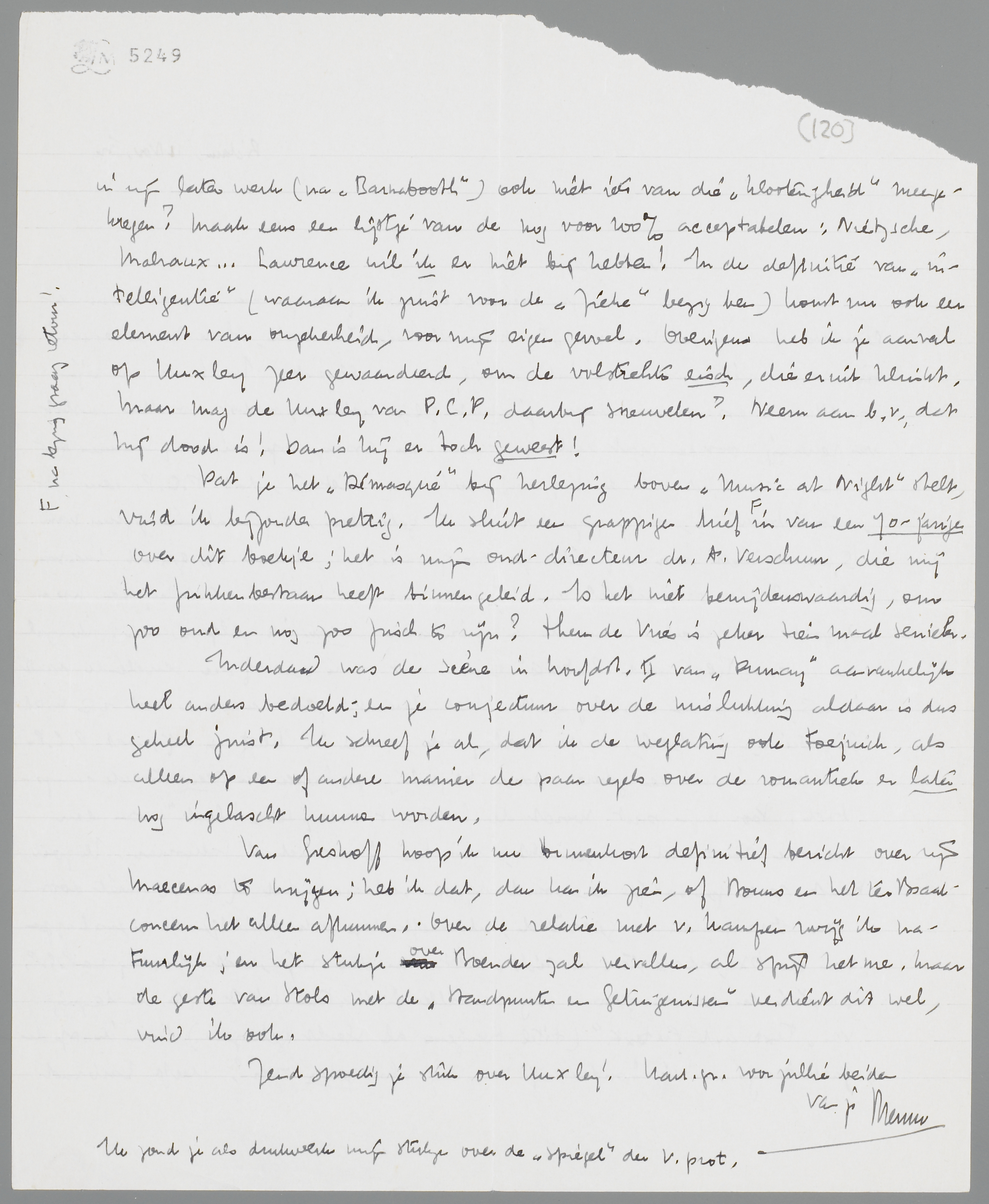 Dat je het Démasqué bij herlezing boven Music at Night stelt, vind ik bijzonder prettig. Ik sluit een grappigen brief [na lezing graag retour!] in van een 70-jarige over dit boekje; het is mijn oud-directeur dr. A. Verschuur, die mij het frikkenbestaan heeft binnengeleid. Is het niet benijdenswaardig, om zoo oud en nog zoo frisch te zijn? Theun de Vries is zeker tien maal senieler.