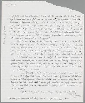 Je brieven over Huxley brengen me in zoo verre in verlegenheid, dat ik den man van Point Counter Point en ook Those Barren Leaves toch maar niet gratis kan laten schieten als intelligent. Ik laat nu zijn novellen en essays even daar; je kunt gelijk hebben, omdat novellen perslot van rekening voor een groot deel op trucs en essays op mimicry kunnen berusten. Maar het wil er bij mij toch nog niet in, dat P.C.P. een ‘klootenboek’ is, om je eigen woorden te gebruiken. Speciaal de figuur van Quarles heeft voor mij iets zoo oorspronkelijks, dat ik op grond daarvan alleen al de originaliteit van Huxley zou volhouden. Dat hij een nare Oxford-kant heeft, neem ik a priori aan, nam ik zelfs al aan; ik zal nu zeker Texts and Pretexts lezen, juist om te zien of die vervelende kant in zijn essays den doorslag geeft. Het element: zich amuseeren met zijn intelligentie (à la Berl) heeft Huxley ook, maar ik blijf er bij, dat P.C.P. een boek is met een zekere drooge bezieling geschreven en geen tweede-rangs-boek. Voor mijn part wordt de latere Huxley een ‘kloot’ van een enorme rondheid en gewicht, misschien is hij het al volkomen. Ik zou haast op een persoonlijk eerewoord durven verklaren, dat Quarles niet door een 2erangsman is gecreëerd, al heeft deze ook duidelijk de eigenschappen van een Oxford-auteur in zich. Het kan dus zijn, dat Huxley na P.C.P. ‘op’ is en dan den gewonen weg van alle litteratoren kiest. Na de lezing van Texts and Pretexts (titel overigens al slecht gekozen) kom ik op de zaak terug. - Wie houden wij nu nog als zeker over? Heeft Larbaud in zijn later werk (na Barnabooth) ook niet iets van die ‘klooterigheid’ meegekregen? Maak eens een lijstje van de nog voor 100% acceptabelen: Nietzsche, Malraux... Lawrence wil ik er niet bij hebben! In de definitie van ‘intelligentie’ (waaraan ik juist voor de Zieke bezig ben) komt nu ook een element van onzekerheid, voor mijn eigen gevoel. Overigens heb ik je aanval op Huxley zeer gewaardeerd, om de volstrekte eisch, die er uit klinkt. Maar mag de Huxley van P.C.P. daarbij sneuvelen? Neem aan b.v., dat hij dood is! Dan is hij er toch geweest!