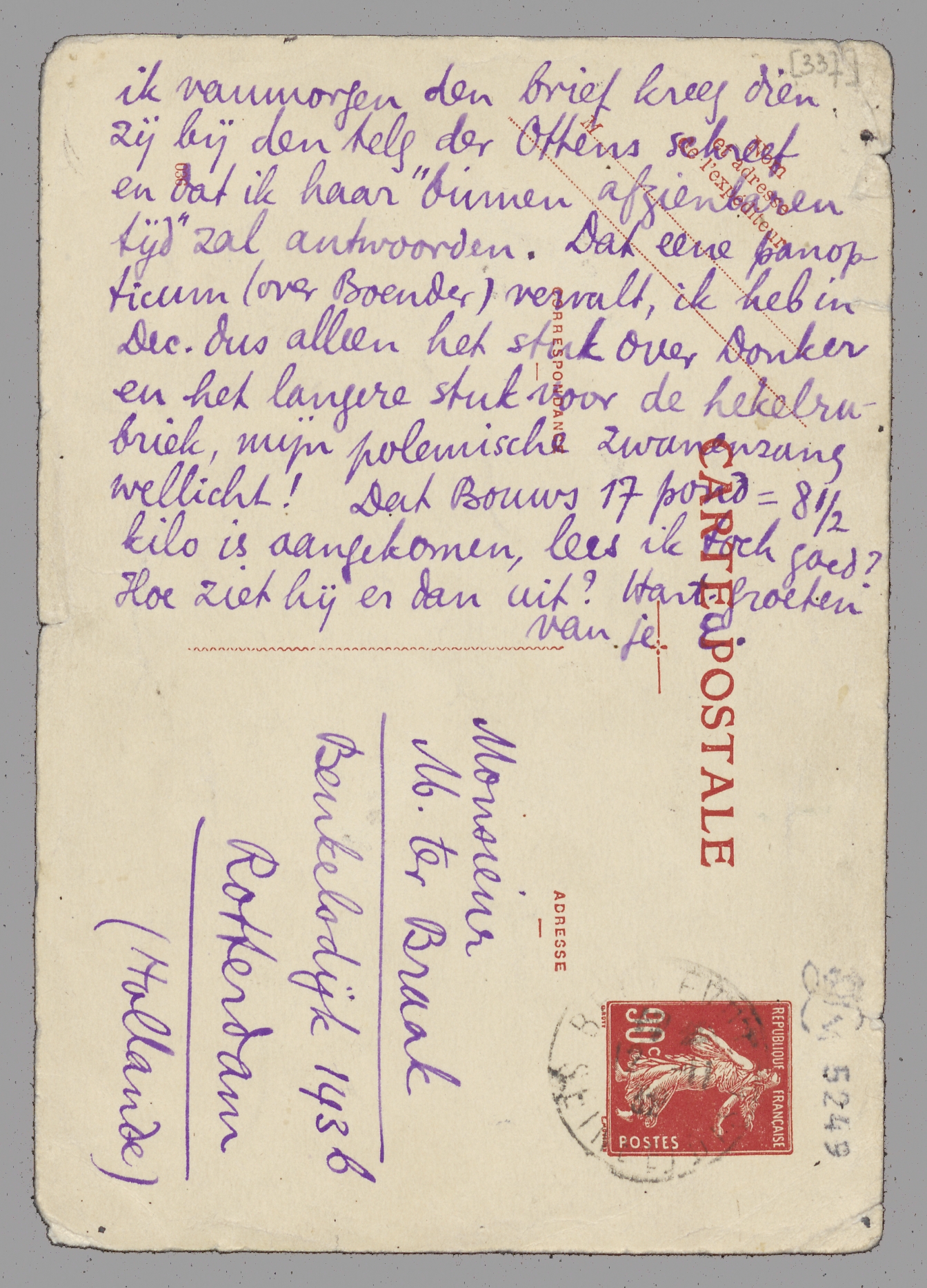 Deze briefkaart was zoo rot; zoo rot gekocht aan het postkantoor! (Ja, dat heb je met die buitenplaatsjes.) Ik stuur je gelijk hiermee de proeven van Schetsboek; nu heb je dus alles compleet. Gr. schreef mij dat Zijlstra fl. 250.- moest hebben, ik dacht dat je hem fl. 200.- geboden had. Enfin! - En komt het nu ‘in eigen beheer’? Vindt Gr. Stols te duur? - De 3 sonnetten heb ik nu aan Gr. gegeven; ze hooren bij elkaar, vind ik, dus laat dat eerste ook maar vervallen. Bouws moet me dan maar 14 regels (à 15 cts) in rekening brengen, dat is 2 gulden en 1 dubbeltje, geloof ik; titel en onderteekening krijg ik misschien gratis? Ik heb je niets naders te vertellen. Zeg Truida dat ik vanmorgen den brief kreeg dien zij bij den telg der Ottens schreef en dat ik haar ‘binnen afzienbaren tijd’ zal antwoorden. Dat eene panopticum (over Boender) vervalt, ik heb in Dec. dus alleen het stuk over Donker en het langere stuk voor de hekelrubriek, mijn polemische zwanenzang wellicht! Dat Bouws 17 pond = 8 1/2 kilo is aangekomen, lees ik toch goed? Hoe ziet hij er dan uit? Hart. groeten van je