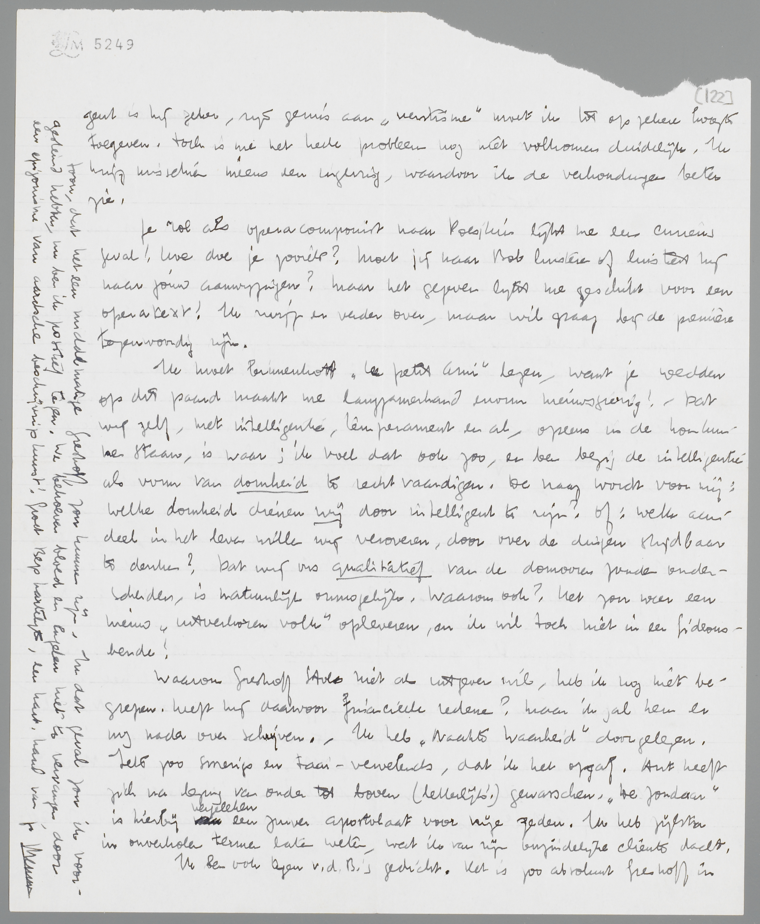 Ik moet binnenkort le petit Ami lezen, want je wedden op dit paard maakt me langzamerhand enorm nieuwsgierig! - Dat wij zelf, met intelligentie, temperament en al, opeens in de kou kunnen staan, is waar; ik voel dat ook zoo, en ben bezig de intelligentie als vorm van domheid te rechtvaardigen. De vraag wordt voor mij: welke domheid dienen wij door intelligent te zijn? Of: welk aandeel in het leven willen wij veroveren, door over de dingen strijdbaar te denken? Dat wij ons qualitatief van de domooren zouden onderscheiden, is natuurlijk onmogelijk. Waarom ook? Het zou weer een nieuw ‘uitverkoren volk’ opleveren, en ik wil toch niet in een Gideonsbende!
