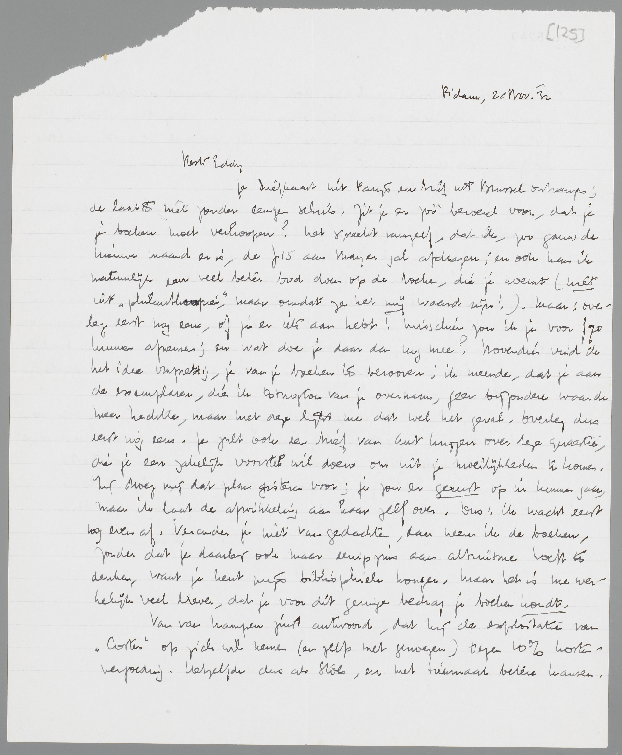 Je briefkaart uit Parijs en brief uit Brussel ontvangen; de laatste niet zonder eenigen schrik. Zit je er zóó beroerd voor, dat je je boeken moet verkoopen? Het spreekt vanzelf, dat ik, zoo gauw de nieuwe maand er is, de f 15 aan Mayer zal afdragen; en ook kan ik natuurlijk een veel beter bod doen op de boeken, die je noemt (niet uit ‘philantropie’, maar omdat ze het mij waard zijn!). Maar: overleg eerst nog eens, of je er iets aan hebt! Misschien zou ik je voor f 70 kunnen afnemen; en wat doe je daar dan nog mee? Bovendien vind ik het idee onprettig, je van je boeken te berooven; ik meende, dat je aan de exemplaren, die ik totnogtoe van je overnam, geen bijzondere waarde meer hechtte, maar met deze lijkt me dat wel het geval. Overleg dus eerst nog eens. Je zult ook een brief van Ant krijgen over deze quaestie, die je een zakelijk voorstel wil doen om uit je moeilijkheden te komen. Zij droeg mij dat plan gisteren voor; je zou er gerust op in kunnen gaan, maar ik laat de afwikkeling aan haar zelf over. Dus: ik wacht eerst nog even af. Verander je niet van gedachten, dan neem ik de boeken, zonder dat je daarbij ook maar eenigszins aan altruïsme hoeft te denken, want je kent mijn bibliophiele honger. Maar het is me werkelijk veel liever, dat je voor dit geringe bedrag je boeken houdt.