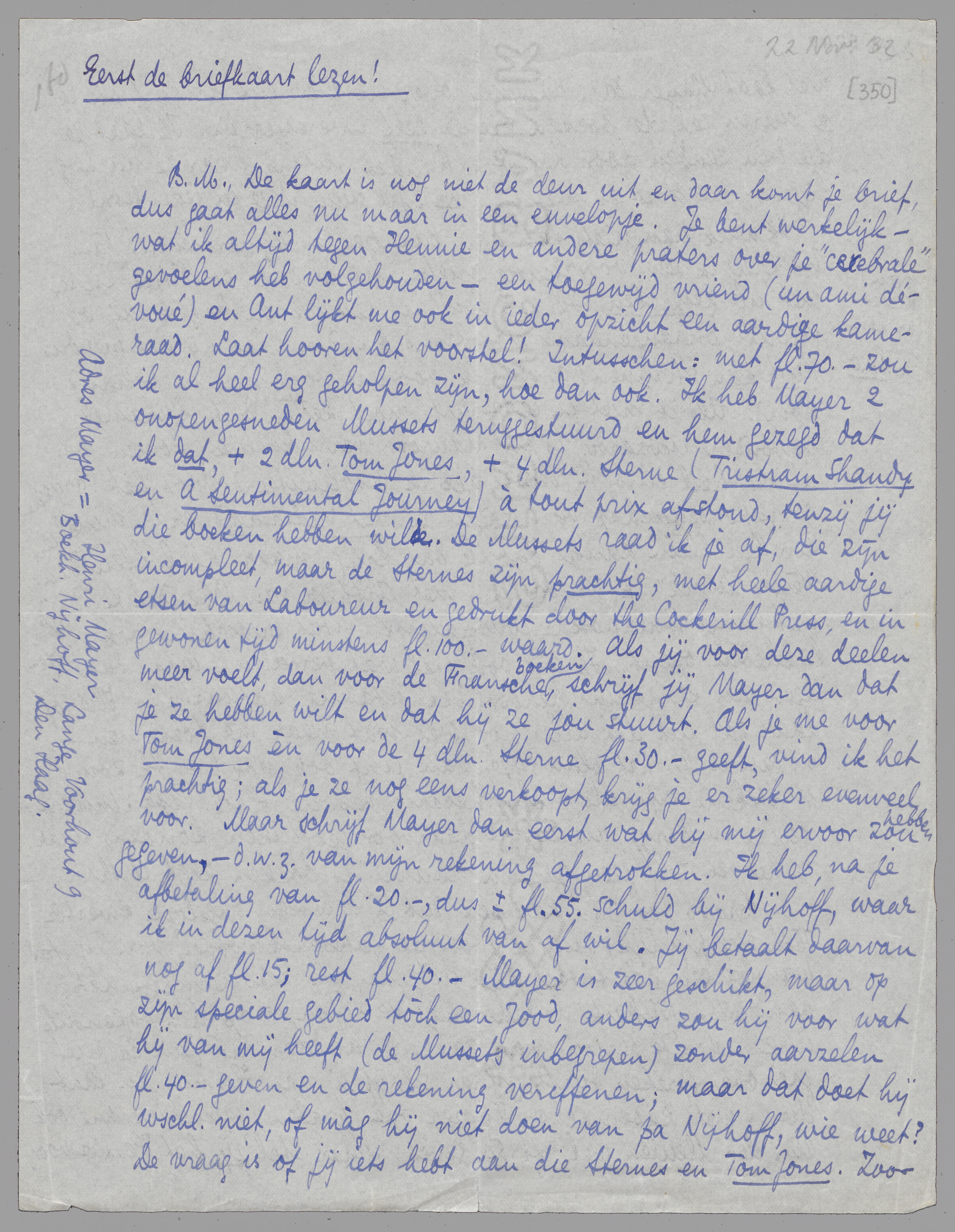 B.M., De kaart is nog niet de deur uit en daar komt je brief, dus gaat alles nu maar in een envelopje. Je bent werkelijk - wat ik altijd tegen Hennie en andere praters over je ‘cerebrale’ gevoelens heb volgehouden - een toegewijd vriend (un ami dévoué) en Ant lijkt me ook in ieder opzicht een aardige kameraad. Laat hooren het voorstel! Intusschen: met fl. 70.- zou ik al heel erg geholpen zijn, hoe dan ook. Ik heb Mayer 2 onopengesneden Mussets teruggestuurd en hem gezegd dat ik dat, + 2 dln Tom Jones, + 4 dln. Sterne (Tristram Shandy en A Sentimental Journey) à tout prix afstond, tenzij jij die boeken hebben wilde. De Mussets raad ik je af, die zijn incompleet, maar de Sternes zijn prachtig, met heele aardige etsen van Laboureur en gedrukt door the Cockerill Press, en in gewonen tijd minstens fl. 100.- waard. Als jij voor deze deelen meer voelt, dan voor de Fransche boeken, schrijf jij Mayer dan dat je ze hebben wilt en dat hij ze jou stuurt. Als je me voor Tom Jones èn voor de 4 dln. Sterne fl. 30.- geeft, vind ik het prachtig; als je ze nog eens verkoopt, krijg je er zeker evenveel voor. Maar schrijf Mayer dan eerst wat hij mij ervoor zou hebben gegeven, - d.w.z. van mijn rekening afgetrokken. Ik heb, na je afbetaling van fl. 20.-, dus ± fl. 55.- schuld bij Nijhoff, waar ik in dezen tijd absoluut van af wil. Jij betaalt daarvan nog af fl. 15.-; rest fl. 40.- Mayer is zeer geschikt, maar op zijn speciale gebied tòch een Jood, anders zou hij voor wat hij van mij heeft (de Mussets inbegrepen) zonder aarzelen fl.40.- geven en de rekening vereffenen; maar dat doet hij wschl. niet, of màg hij dat niet doen van pa Nijhoff, wie weet? De vraag is of jij iets hebt aan die Sternes en Tom Jones. Zoo niet, laat Mayer dan aan mij over en kies uit de lijst die ik je sturen zal, de boeken die je zelf interesseren. Ik laat je die dan zenden door den boekhandel Moens, waar ze nu nog liggen. Haast is er niet bij. De lijst stuur ik je in ieder geval.