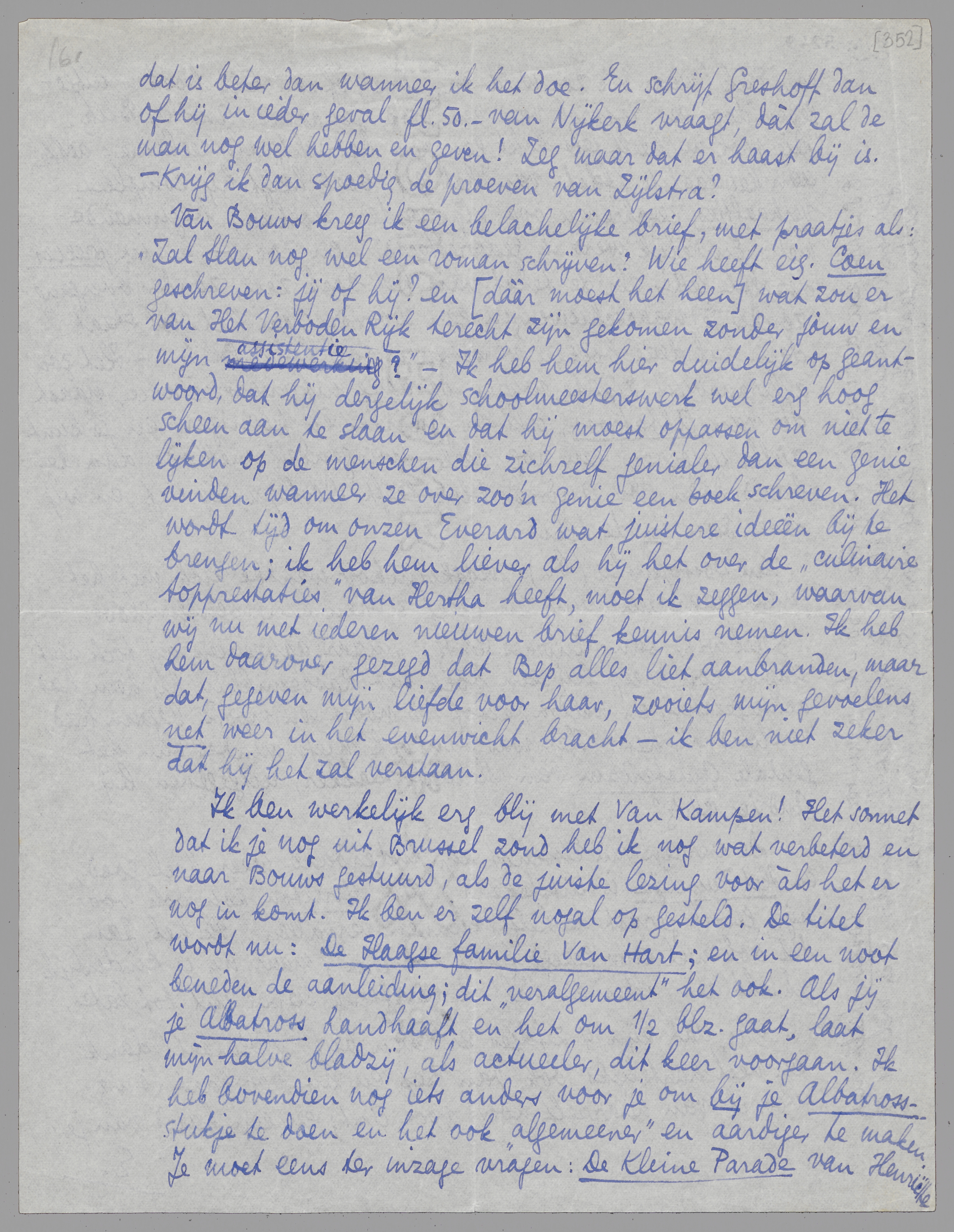Ik ben werkelijk erg blij met Van Kampen! Het sonnet dat ik je nog uit Brussel zond heb ik nog wat verbeterd en naar Bouws gestuurd, als de juiste lezing voor àls het er nog in komt. Ik ben er zelf nogal op gesteld. De titel wordt nu: De Haagse familie Van Hart; en in een noot beneden de aanleiding; dit ‘veralgemeent’ het ook. Als jij je Albatross handhaaft en het om 1/2 blz. gaat, laat mijn halve bladzij, als actueeler, dit keer voorgaan. Ik heb bovendien nog iets anders voor je om bij je Albatross-stukje te doen en het ook ‘algemeener’ en aardiger te maken. Je moet eens ter inzage vragen: De Kleine Parade van Henriëtte van Eijk (waar Vic zoo wild over doet, of is). Dit boek is uitgegeven door een rasprol van een Jood, Andries Blitz. Die prol nu heeft iets ècht geniaals bedacht, als reclame: achteraan het laatste hfdst. van het eig. boek heeft hij compleet verhaaltjes geschreven over zijn verdere boeken, beginnende met: ‘Eindelijk werd ik gearresteerd’ - en zoo, - en in precies dezelfde letter als de tekst van het boek zelf, zonder overgang, zonder ‘te waarschuwen’, in één woord. Aan het slot staat dan: al deze boeken verschenen ook bij A. Blitz. - Het zou alleraardigst zijn te wijzen op deze uitgeversreclame, naast die van Albatross, als èn genialer èn poeniger, en je kunt zùlke uitgevers een nog veel ‘dwingender’ methode aan de hand doen, bv. Andries Blitz geeft Dostojevsky uit, en wij lezen dan in de tekst: