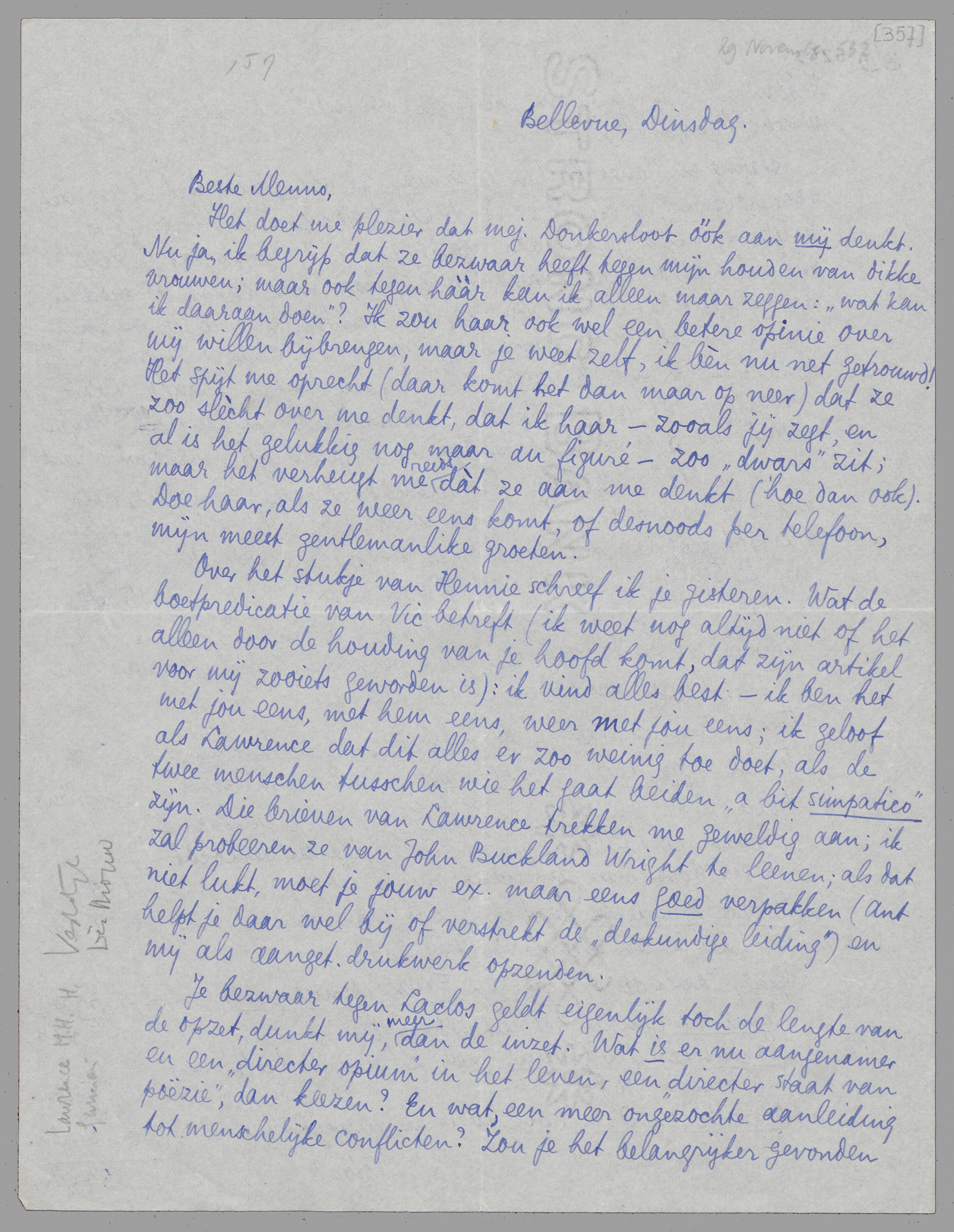 Over het stukje van Hennie schreef ik je gisteren. Wat de boetpredicatie van Vic betreft (ik weet nog altijd niet of het alleen door de houding van je hoofd komt, dat zijn artikel voor mij zooiets geworden is): ik vind alles best - ik ben het met jou eens, met hem eens, weer met jou eens; ik geloof als Lawrence dat dit alles er zoo weinig toe doet, als de twee menschen tusschen wie het gaat beiden ‘a bit simpatico’ zijn. Die brieven van Lawrence trekken me geweldig aan; ik zal probeeren ze van John Buckland Wright te leenen; als dat niet lukt, moet je jouw ex. maar eens goed verpakken (Ant helpt je daar wel bij of verstrekt de ‘deskundige leiding’) en mij als aanget. drukwerk opzenden.