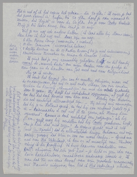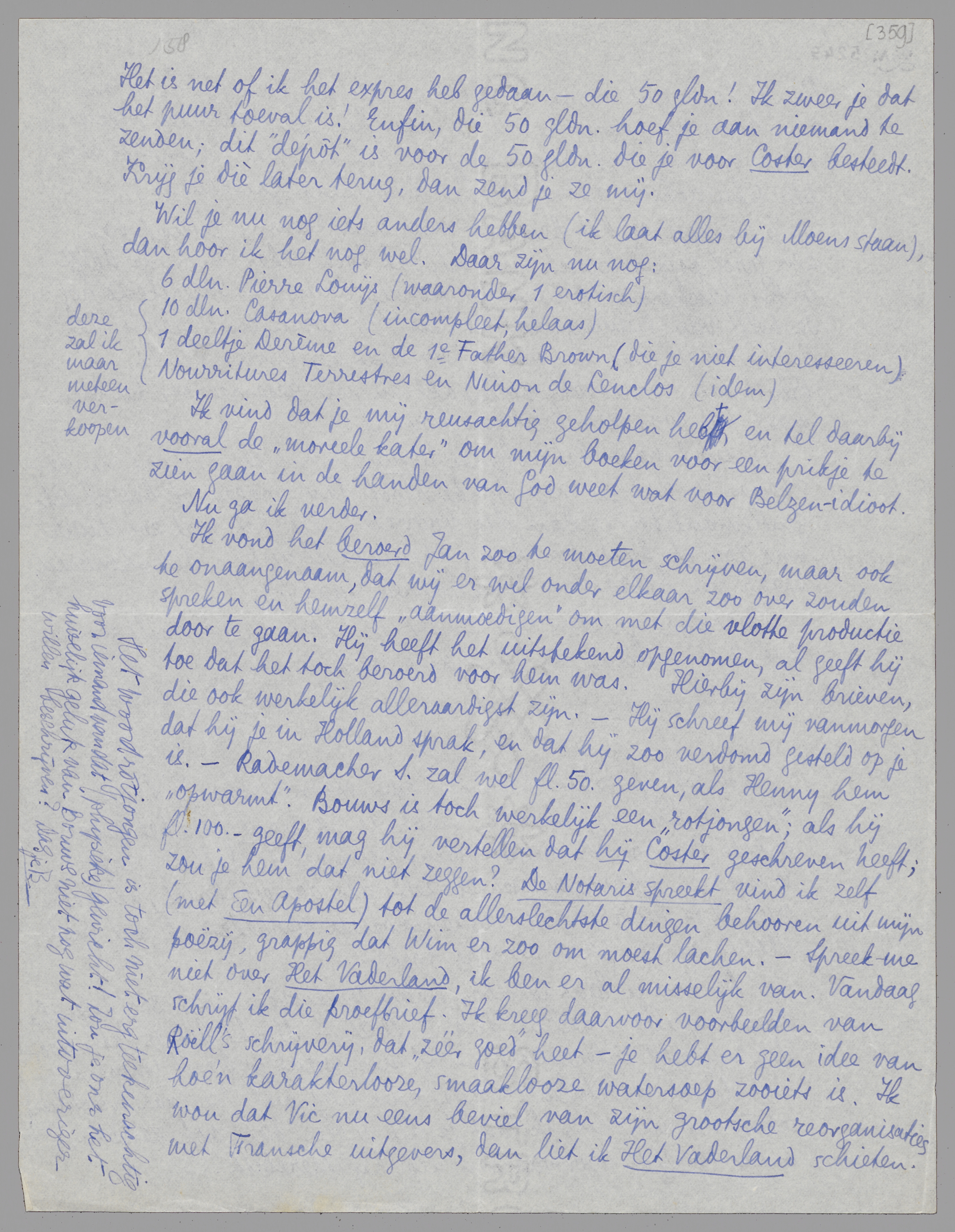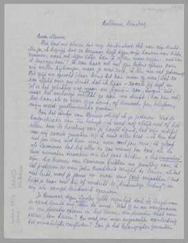 Ik vond het beroerd Jan zoo te moeten schrijven, maar ook te onaangenaam, dat wij er wel onder elkaar zoo over zouden spreken en hemzelf ‘aanmoedigen’ om met die vlotte productie door te gaan. Hij heeft het uitstekend opgenomen, al geeft hij toe dat het toch beroerd voor hem was. Hierbij zijn brieven, die ook werkelijk alleraardigst zijn. - Hij schreef mij vanmorgen dat hij je in Holland sprak, en dat hij zoo verdomd gesteld op je is. - Rademacher S. zal wel fl 50.- geven, als Henny hem ‘opwarmt’. Bouws is toch werkelijk een ‘rotjongen’; als hij fl. 100.- geeft, mag hij vertellen dat hij Coster geschreven heeft; zou je hem dat niet zeggen? De Notaris spreekt vind ik zelf (met een Apostel) tot de allerslechtste dingen behooren uit mijn poëzij, grappig dat Wim er zoo om moest lachen. - Spreek me niet over Het Vaderland, ik ben er al misselijk van. Vandaag schrijf ik die proefbrief. Ik kreeg daarvoor voorbeelden van Roëll's schrijverij, dat ‘zéér goed’ heet - je hebt er geen idee van hoe 'n karakterlooze, smaaklooze watersoep zooiets is. Ik wou dat Vic nu eens beviel van zijn grootsche reorganisaties met Fransche uitgevers, dan liet ik Het Vaderland schieten.