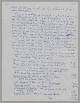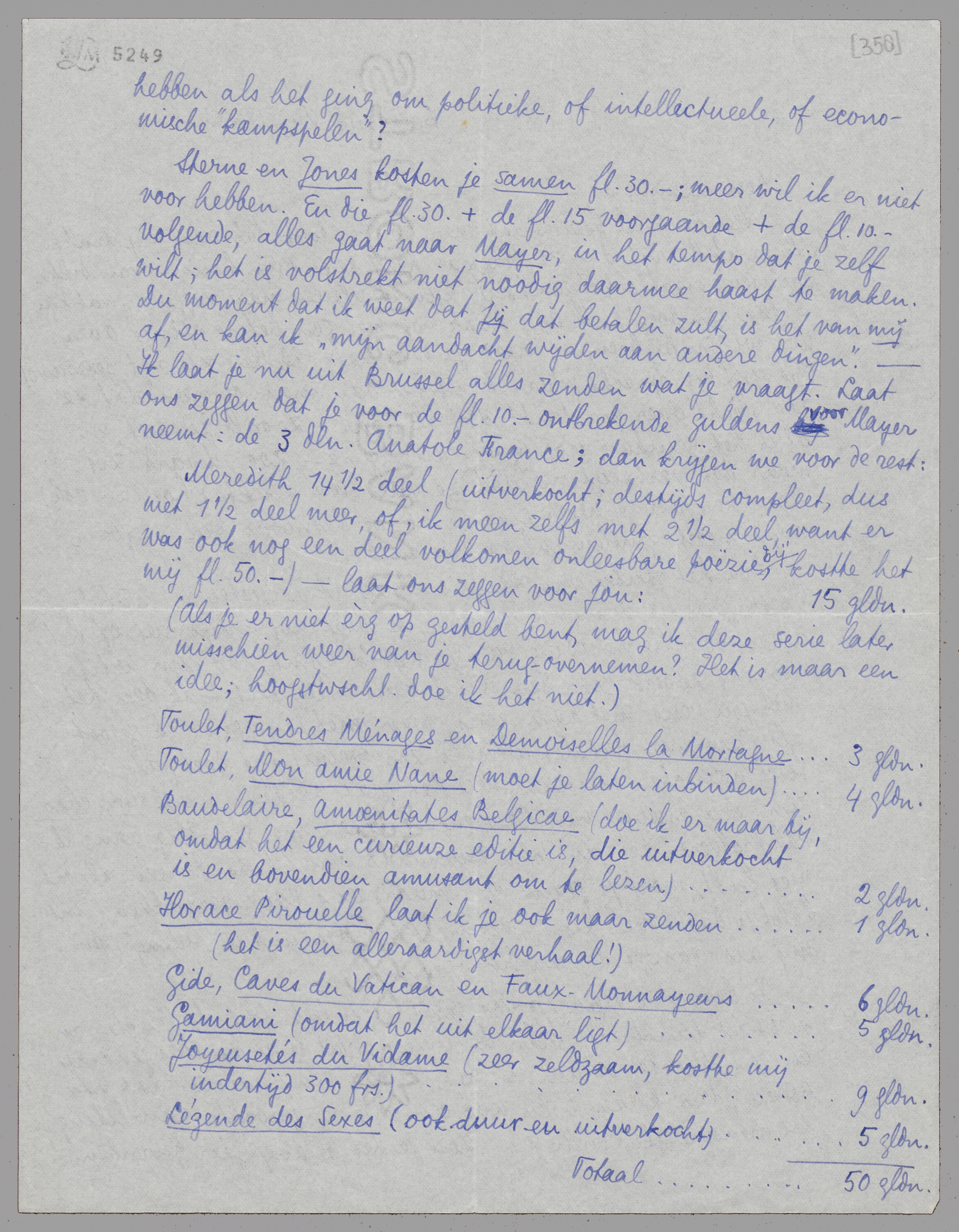 Sterne en Jones kosten je samen fl. 30.-; meer wil ik er niet voor hebben. En die fl. 30.- + de fl. 15.- voorgaande + de fl.10.- volgende, alles gaat naar Mayer, in het tempo dat je zelf wilt; het is volstrekt niet noodig daarmee haast te maken. Du moment dat ik weet dat jij dat betalen zult, is het van mij af, en kan ik ‘mijn aandacht wijden aan andere dingen’. - Ik laat je nu uit Brussel alles zenden wat je vraagt. Laat ons zeggen dat je voor de fl. 10.- ontbrekende guldens voor Mayer neemt: de 3 dln. Anatole France; dan krijgen we voor de rest: