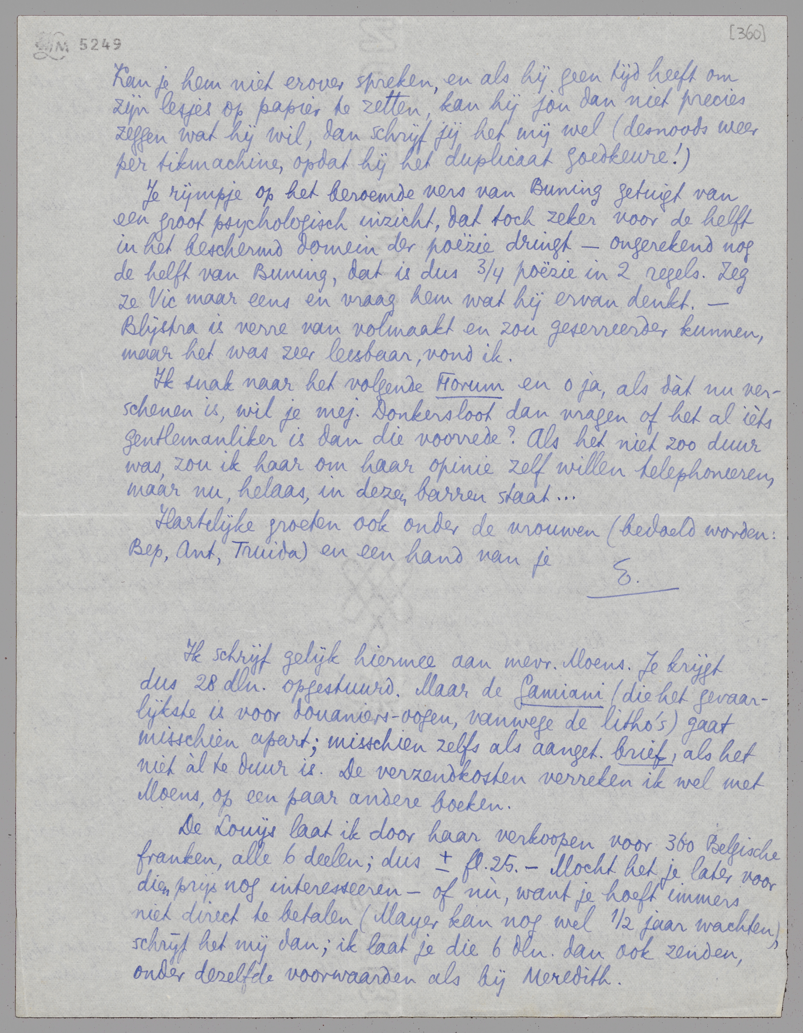 De Louijs laat ik door haar verkoopen voor 360 Belgische franken, alle 6 deelen; dus ± fl. 25.- Mocht het je later voor die prijs nog interesseeren - of nù, want je hoeft immers niet direct te betalen (Mayer kan nog wel 1/2 jaar wachten), schrijf het mij dan; ik laat je die 6 dln. dan ook zenden, onder dezelfde voorwaarden als bij Meredith.