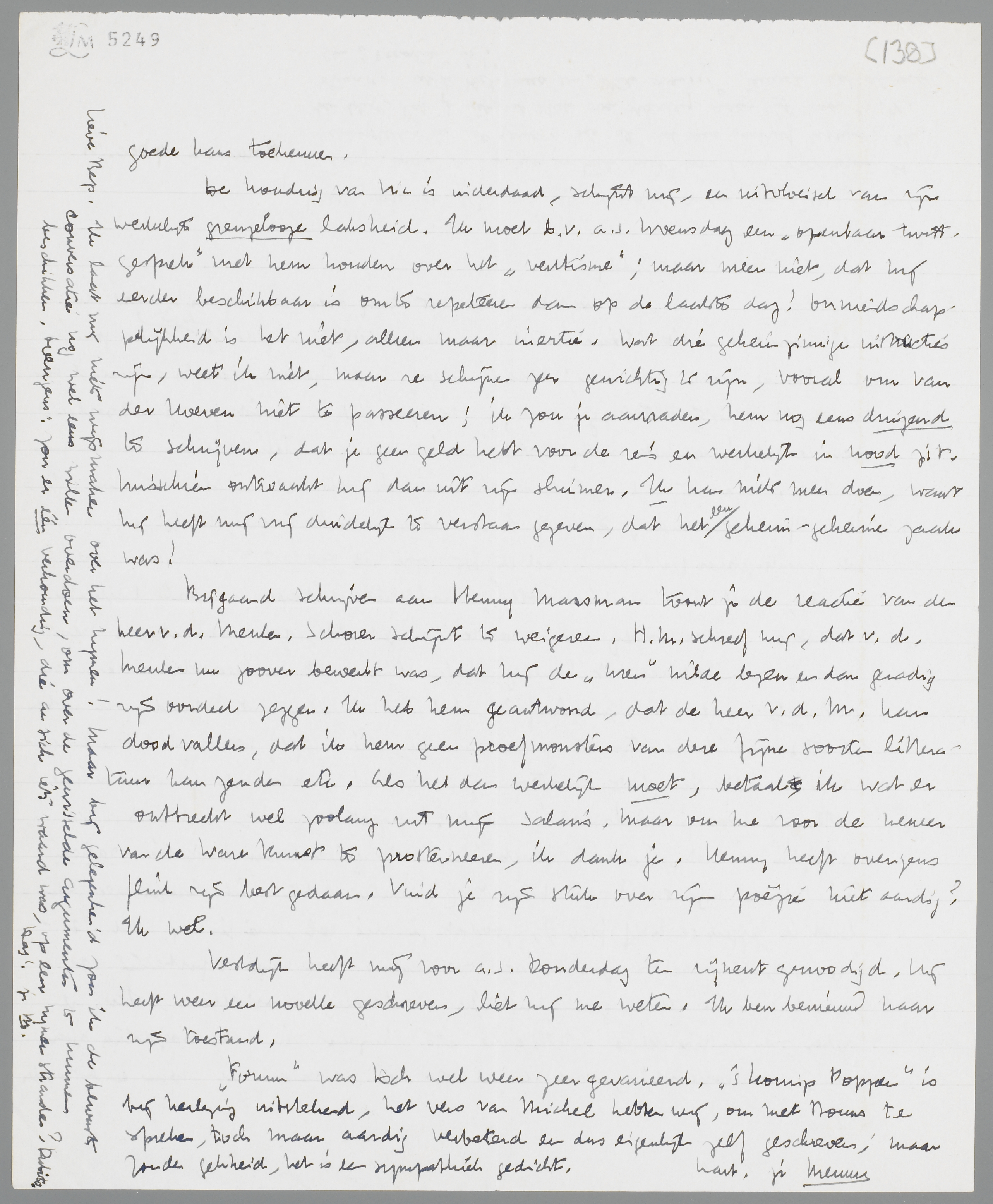 De houding van Vic is inderdaad, schijnt mij, een uitvloeisel van zijn werkelijk grenzelooze laksheid. Ik moet b.v. a.s. Woensdag een ‘openbaar twistgesprek’ met hem houden over het ‘ventisme’; maar meen niet, dat hij eerder beschikbaar is om te repeteeren dan op de laatste dag! Onvriendschappelijkheid is het niet, alleen maar inertie. Wat die geheimzinnige instructies zijn, weet ik niet, maar ze schijnen zeer gewichtig te zijn, vooral om van der Hoeven niet te passeeren; ik zou je aanraden, hem nog eens dringend te schrijven, dat je geen geld hebt voor de reis en werkelijk in nood zit. Misschien ontwaakt hij dan uit zijn sluimer. Ik kan niets meer doen, want hij heeft mij vrij duidelijk te verstaan gegeven, dat het een geheim-geheime zaak was! Bijgaand schrijven aan Henny Marsman toont je de reactie van den heer v.d. Meulen. Schorer schijnt te weigeren. H.M. schreef mij, dat v.d. Meulen nu zoover bewerkt was, dat hij de Uren wilde lezen en dan genadig zijn oordeel zeggen. Ik heb hem geantwoord, dat de heer v.d. M. kan dood vallen, dat ik hem geen proefmonsters van deze fijne soorten literatuur kan zenden etc. Als het dan werkelijk moet, betaal ik wat er ontbreekt wel zoolang uit mijn salaris. Maar om me voor de meneer van de Ware Kunst te prosteneeren, ik dank je. Henny heeft overigens flink zijn best gedaan. Vind je zijn stuk over zijn poezie niet aardig? Ik wel. Vestdijk heeft mij voor a.s. Donderdag ten zijnent genoodigd. Hij heeft weer een novelle geschreven, liet hij me weten. Ik ben benieuwd naar zijn toestand.