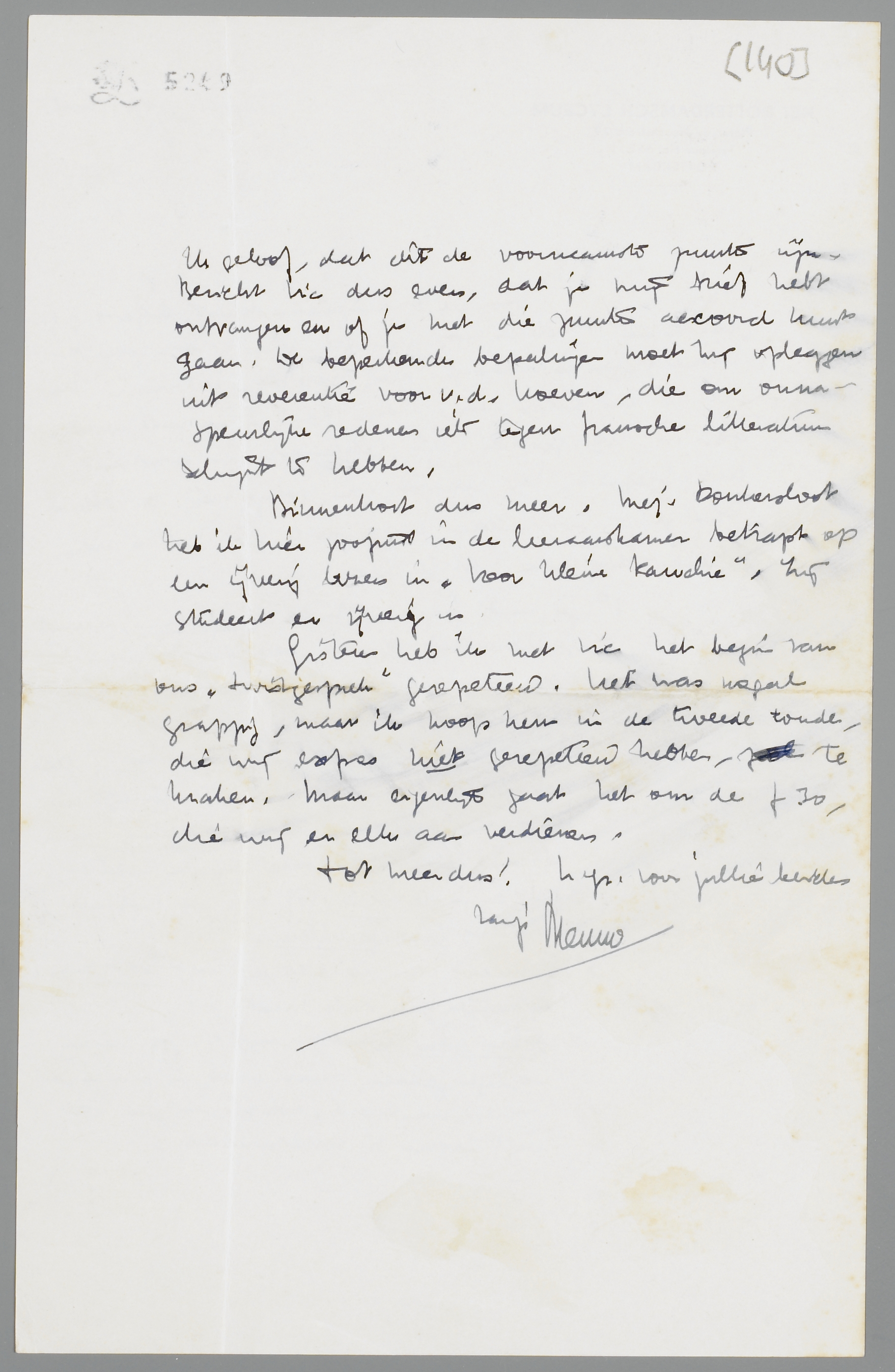 Ik geloof, dat dit de voornaamste punten zijn. Bericht Vic dus even, dat je mijn brief hebt ontvangen en of je met die punten accoord kunt gaan. De beperkende bepalingen moet hij opleggen uit reverentie voor v.d. Hoeven, die om onnaspeurlijke redenen iets tegen fransche litteratuur schijnt te hebben.