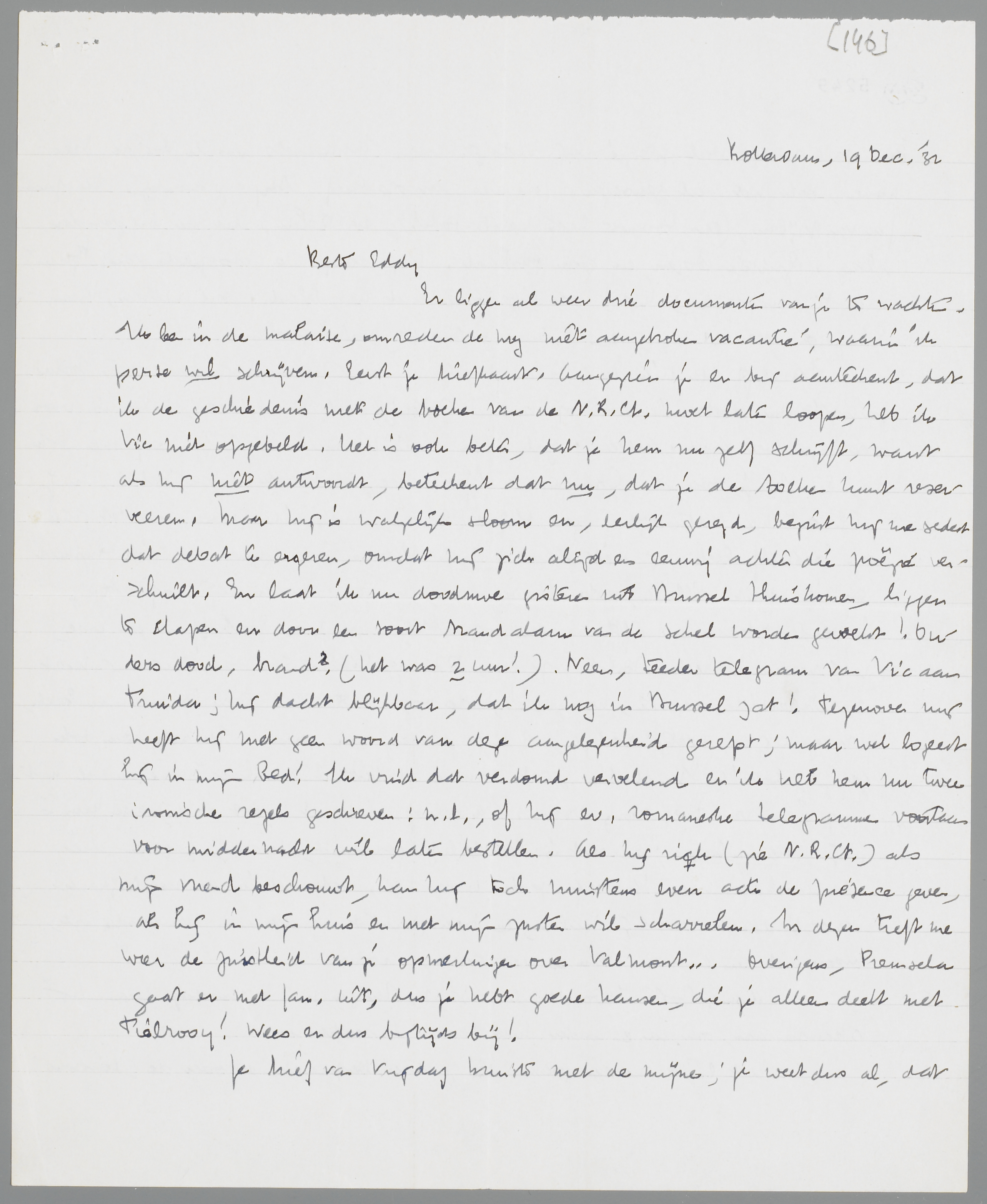 Er liggen al weer drie documenten van je te wachten. Ik ben in de malaise, omreden de nog niet aangebroken vacantie, waarin ik perse wil schrijven. Eerst je briefkaart. Aangezien je er bij aanteekent, dat ik de geschiedenis met de boeken van de N.R.Ct. moet laten lopen, heb ik Vic niet opgebeld. Het is ook beter, dat je hem nu zelf schrijft, want als hij niet antwoordt, beteekent dat nu, dat je de boeken kunt reserveeren. Maar hij is walgelijk sloom en, eerlijk gezegd, begint hij me sedert dat debat te ergeren, omdat hij zich altijd en eeuwig achter die poëzie verschuilt. En laat ik nu doodmoe gisteren uit Brussel thuiskomen, liggen te slapen en door een soort brandalarm van de schel worden gewekt! Ouders dood, brand? (het was 2 uur!). Neen, teeder telegram van Vic aan Truida; hij dacht blijkbaar, dat ik nog in Brussel zat! Tegenover mij heeft hij met geen woord van deze aangelegenheid gerept; maar wel logeert hij in mijn bed! Ik vind het verdomd vervelend en ik heb hem nu twee ironische regels geschreven: n.l., of hij ev. romaneske telegrammen voortaan voor middernacht wil laten bestellen. Als hij zich (zie N.R.Ct.) als mijn vriend beschouwt, kan hij toch minstens even acte de presence geven, als hij in mijn huis en met mijn zuster wil scharrelen. In dezen treft me weer de juistheid van je opmerkingen over Valmont…. Overigens, Premsela gaat er met Jan. uit, dus je hebt goede kansen, die je alleen deelt met Tielrooy! Wees er dus bijtijds bij!