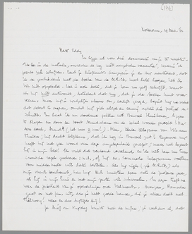 En waarom zou het onmogelijk zijn, een soort Cahiers (te zijner tijd) uit je brieven te trekken? Dat heb je vroeger toch ook gedaan? Maar ik zou, als ik jou was, er pas dan toe overgaan, als je werkelijk voelt, voor een zekere periode leeggeschreven te zijn. Nu je derde brief, die me steeds nieuwsgieriger maakt naar de revolutie! Ik zal je plan met Zijlstra (ev. eerst met Bouws) bespreken, maar veel verwacht ik er niet van. Iemand als Zijlstra is geen man van bibliophiele, of zelfs maar ‘cahierachtige’ dingen. We zouden nog eerder, geloof ik, iets met zijn bijkantoor De Waelburgh kunnen bereiken. Maar ik zal er eens over spreken. Pro Domo en Heineke Vos komen toch al apart uit! Maar Zijlstra een Faber & Faber? Het zou bijna een belediging aan Ant's adres zijn...