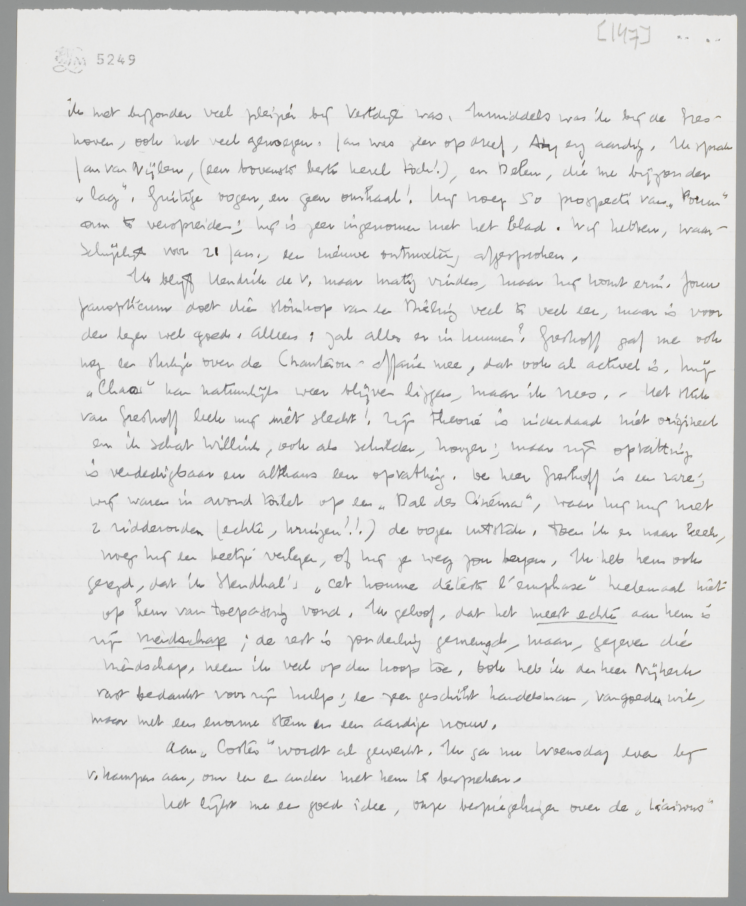 Ik blijf Hendrik de V. maar matig vinden, maar hij komt erin. Jouw panopticum doet die stomkop van een Bieling veel te veel eer, maar is voor den lezer wel goed. Alleen: zal alles erin kunnen? Greshoff gaf me ook nog een stukje over de Chanterou-affaire mee, dat ook al actueel is. Mijn Chaos kan natuurlijk weer blijven liggen, naar ik vrees. - Het stuk van Greshoff leek mij niet slecht! Zijn theorie is inderdaad niet origineel en ik schat Willink, ook als schilder, hooger; maar zijn opvatting is verdedigbaar en althans een opvatting. De heer Greshoff is een rare; wij waren in avondtoilet op een Bal des Cinémas, waar hij mij met 2 ridderorden (echte, kruizen!!) de oogen uitstak. Toen ik er naar keek, vroeg hij een beetje verlegen, of hij ze weg zou bergen. Ik heb hem ook gezegd, dat ik Stendhal's ‘cet homme déteste l'emphase’ heelemaal niet op hem van toepassing vond. Ik geloof, dat het meest echte aan hem is zijn vriendschap; de rest is zonderling gemengd, maar, gegeven die vriendschap, neem ik veel op den koop toe. Ook heb ik den heer Nijkerk vast bedankt voor zijn hulp; een zeer geschikt handelsman, van goeden wil, maar met een enorme stem en een aardige vrouw.