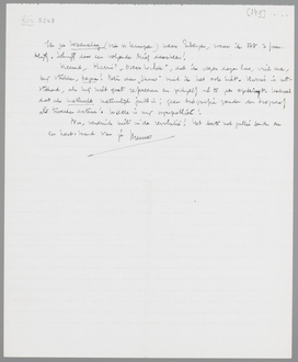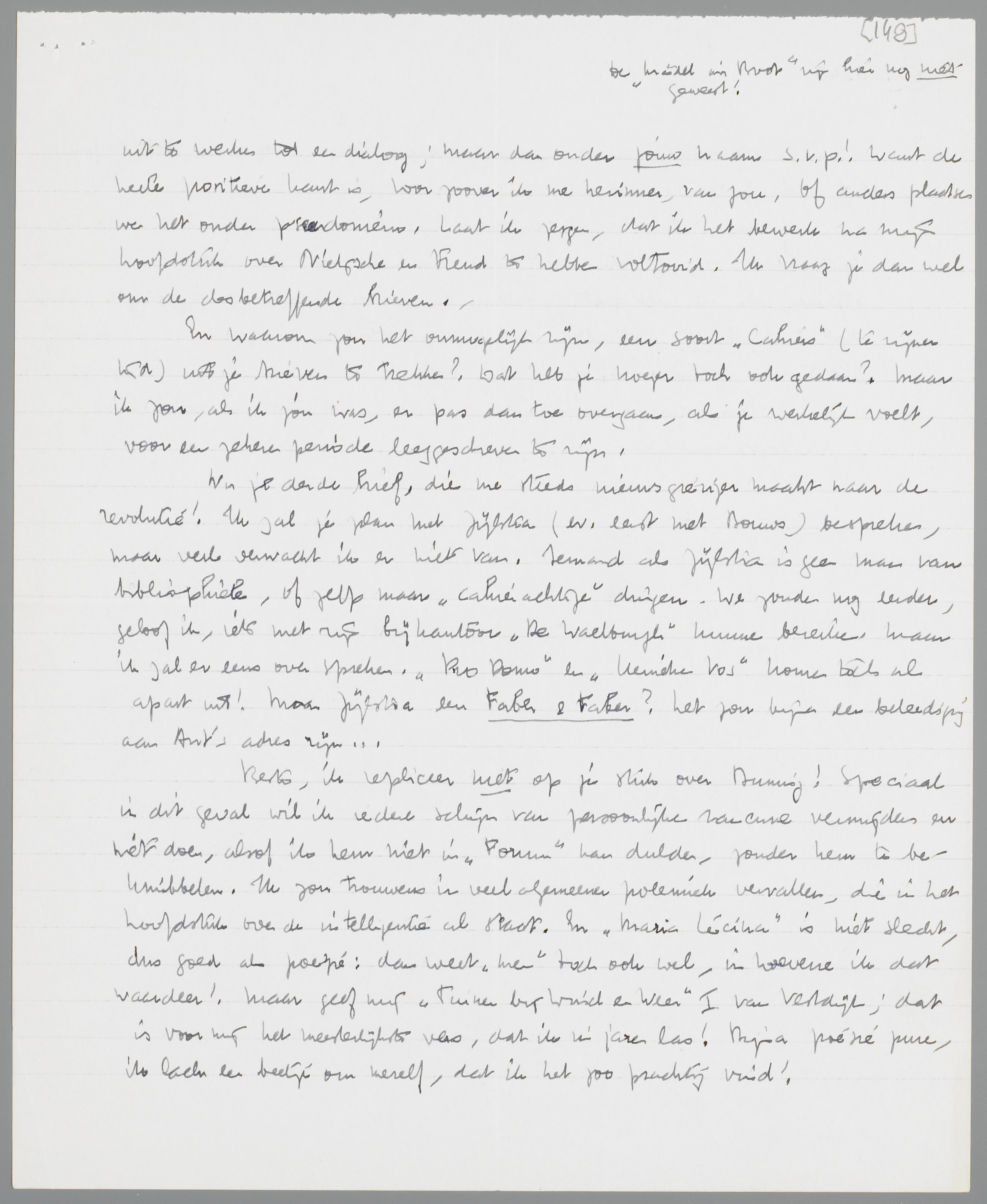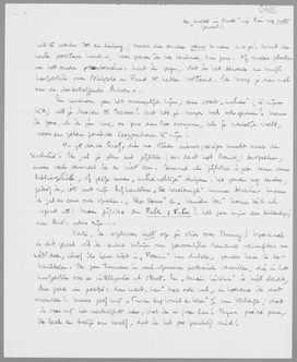 Het lijkt me een goed idee, onze bespiegelingen over de Liaisons uit te werken tot een dialoog; maar dan onder jouw naam s.v.p.! Want de heele positieve kant is, voor zoover ik me herinner, van jou. Of anders plaatsen we het onder pseudoniem. Laat ik zeggen, dat ik het bewerk na mijn hoofdstuk over Nietzsche en Freud te hebben voltooid. Ik vraag je dan wel om de desbetreffende brieven.