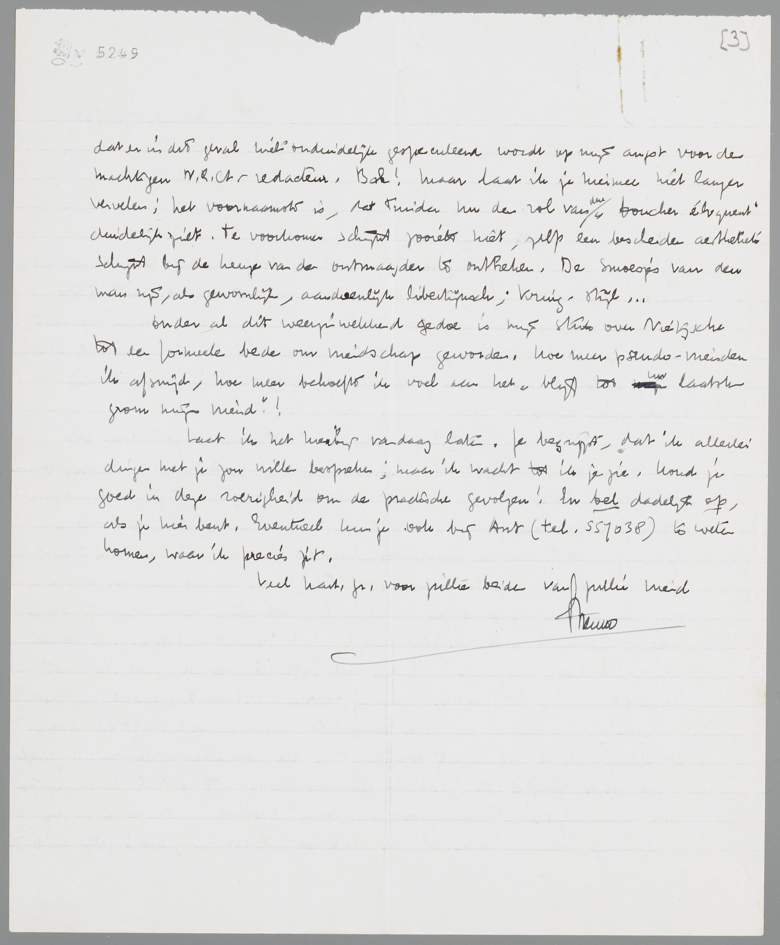 Mijn laatste dagen zijn volkomen verpest door het individu van Vriesland, mede een van de grootste lafbekken, die er op gods aardbodem rondloopen. Als je mijn vorige brief kreeg, weet je, hoe hij zich gedragen heeft: een joodsche compôte van Valmont en le neveu de Rameau. Gelukkig heeft Truida de knoop doorgehakt en hem de bons gegeven; mij heeft hij op alle mogelijke manieren ontdoken, maar ik heb hem nu a.s. Maandag een gesprek opgedrongen, waarin hij het één en ander van mij hooren zal. Mijnheer is n.b. verontwaardigd, dat ik mij met deze zaak bemoei en vindt dat ‘burgerlijk’. Enfin, het heeft dit voordeel, dat ik mijn vriendschap nog iets precieser kan afgrenzen. Het meest irriteert mij de sloomheid, waarmee hij alles behandelt; in mijn bed maft en iederen opheldering als te veel moeite beschouwt. – De komische zijde van het geval zal zonder twijfel zijn, dat ik als medewerker uit de N.R.C. verdwijn en waarschijnlijk Forum voortaan ‘zuur’ besproken zal worden. Zoo zijn deze heeren nu eenmaal; ik weet het uit ervaring; het is zelfs duidelijk dat er in dit geval niet onduidelijk gespeculeerd wordt op mijn angst voor de machtigen N.R.C.-redacteur. Bah! Maar laat ik je hiermee niet langer vervelen; het voornaamste is, dat Truida nu den rol van de ‘boucher éloquent’ duidelijk ziet. Te voorkomen schijnt zoiets niet, zelfs een bescheiden aesthetiek schijnt bij de keuze van de ontmaagder te ontbreken. De smoesjes van den man zijn, als gewoonlijk, aandoenlijk libertijnsch; Kring-stijl…