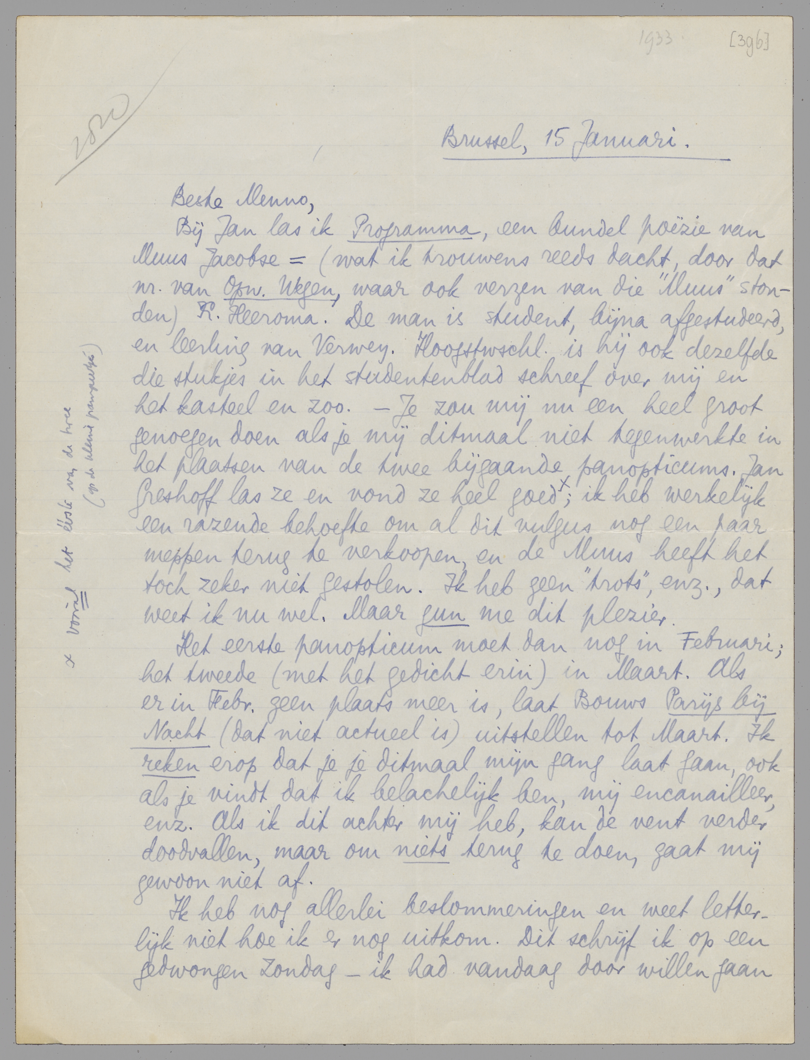 Bij Jan las ik Programma, een bundel poëzie van Muus Jacobse = (wat ik trouwens reeds dacht, door dat nr. van Opw. Wegen, waar ook verzen van die ‘Muus’ stonden) K. Heeroma. De man is student, bijna afgestudeerd, en leerling van Verwey. Hoogstwschl. is hij ook dezelfde die stukjes in het studentenblad schreef over mij en het kasteel en zoo. - Je zou me nu een heel groot genoegen doen als je mij ditmaal niet tegenwerkte in het plaatsen van de twee bijgaande panopticums. Jan Greshoff las ze en vond ze heel goed [vooràl het éérste van de twee (op de kleine pampiertjes]; ik heb werkelijk een razende behoefte om al dit vulgus nog een paar meppen terug te verkoopen, en de Muus heeft het toch zeker niet gestolen. Ik heb geen ‘trots’, enz., dat weet ik nu wel. Maar gun me dit plezier.