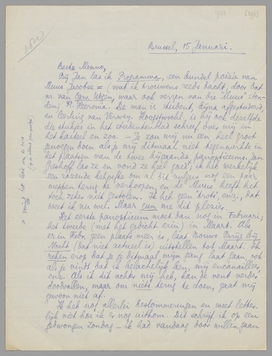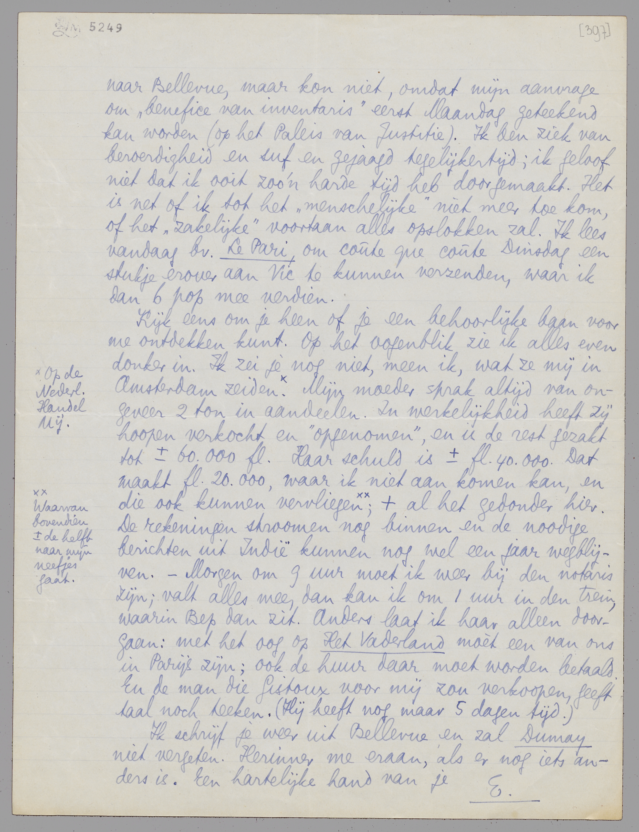 Kijk eens om je heen of je een behoorlijke baan voor me ontdekken kunt. Op het oogenblik zie ik alles even donker in. Ik zei je nog niet, meen ik, wat ze mij in Amsterdam zeiden. [Op de Nederl. Handel Mij.] Mijn moeder sprak altijd van ongeveer 2 ton in aandeelen. In werkelijkheid heeft zij hoopen verkocht en ‘opgenomen’, en is de rest gezakt tot ± 60.000 fl. Haar schuld is ± fl. 40.000. Dat maakt fl. 20.000, waar ik niet aan komen kan, en die ook kunnen vervliegen [waarvan bovendien ± de helft naar mijn neefjes gaat]; + al het gedonder hier. De rekeningen stroomen nog binnen en de noodige berichten uit Indië kunnen nog wel een jaar wegblijven. - Morgen om 9 uur moet ik weer bij den notaris zijn; valt alles mee, dan kan ik om 1 uur in den trein, waarin Bep dan zit. Anders laat ik haar alleen doorgaan: met het oog op Het Vaderland moèt een van ons in Parijs zijn; ook de huur daar moet worden betaald. En de man die Gistoux voor mij zou verkoopen, geeft taal noch teeken. (Hij heeft nog maar 5 dagen tijd.)