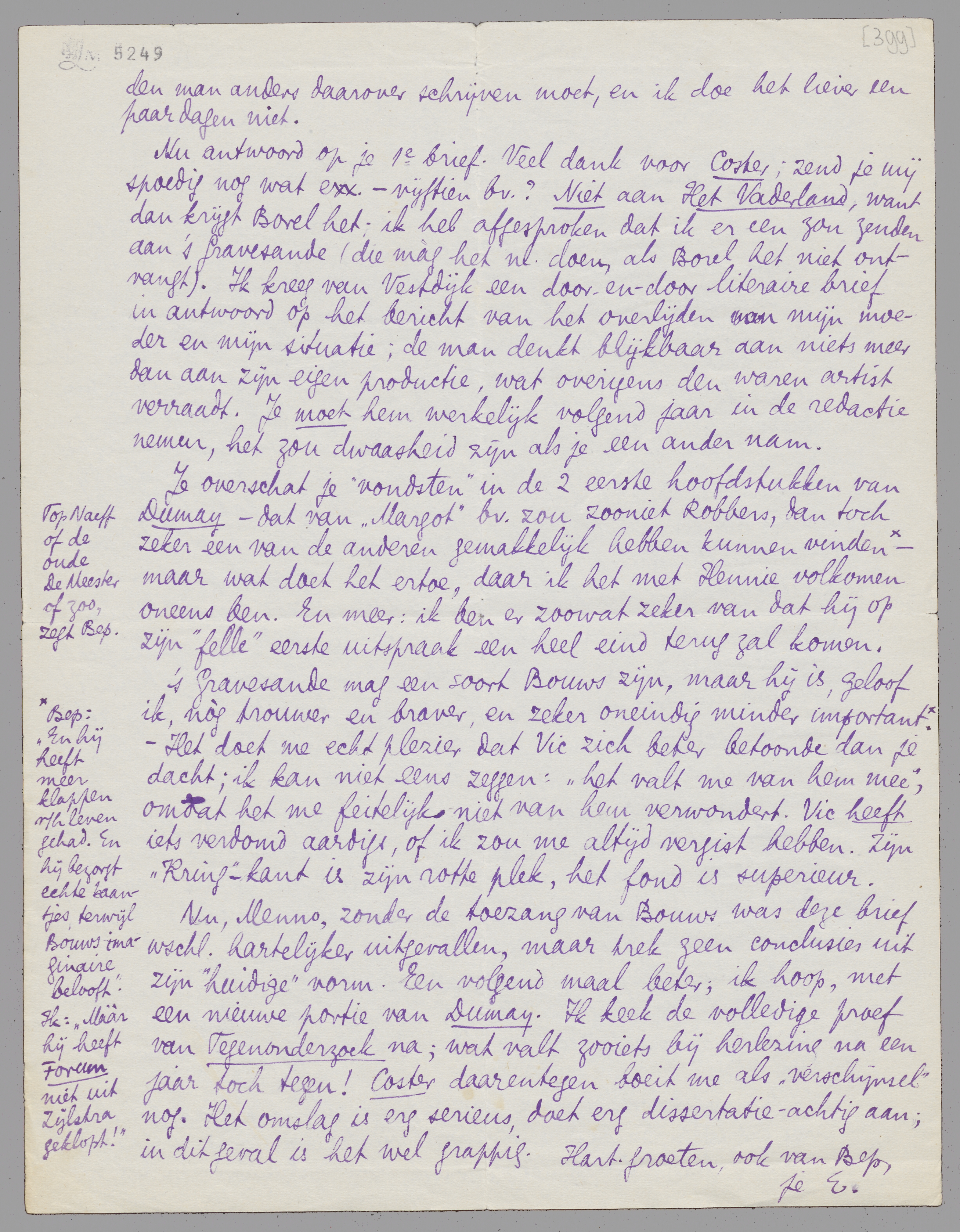 Je overschat je ‘vondsten’ in de 2 eerste hoofdstukken van Dumay - dat van ‘Margot’ bv. zou zooniet Robbers, dan toch zeker een van de anderen gemakkelijk hebben kunnen vinden [Top Naeff of de oude De Meester of zoo, zegt Bep] - maar wat doet het ertoe, daar ik het met Hennie volkomen oneens ben. En meer: ik ben er zoowat zeker van dat hij op zijn ‘felle’ eerste uitspraak een heel eind terug zal komen.