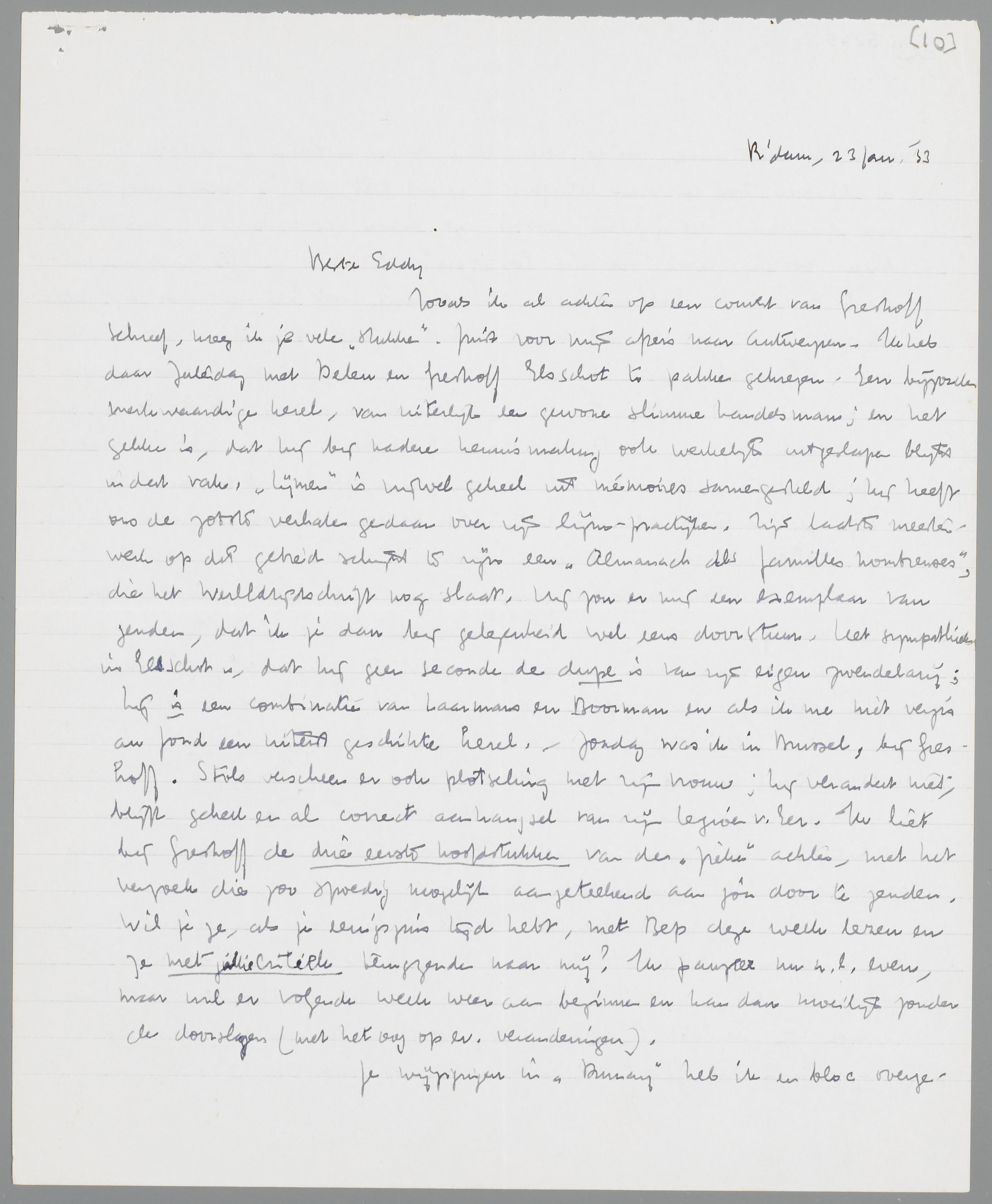 Zooals ik al achter op een couvert van Greshoff schreef, kreeg ik je vele ‘stukken’. Juist voor mijn afreis naar Antwerpen. Ik heb daar Zaterdag met Delen en Greshoff Elsschot te pakken gekregen. Een bijzonder merkwaardige kerel, van uiterlijk een gewone slimme handelsman; en het gekke is, dat hij bij nadere kennismaking ook werkelijk uitgeslapen blijkt in dat vak. Lijmen is vrijwel geheel uit mémoires samengesteld; hij heeft ons de zotste verhalen gedaan over zijn lijmpractijken. Zijn laatste meesterwerk op dit gebied schijnt te zijn een Almanach des familles nombreuses, die het Wereldtijdschrift nog slaat. Hij zou er mij een exemplaar van zenden, dat ik je dan bij gelegenheid wel eens doorstuur. Het sympathieke in Elsschot is, dat hij geen seconde de dupe is van zijn eigen zwendelarij; hij is een combinatie van Laarmans en Boorman en als ik me niet vergis au fond een uiterst geschikte kerel. - Zondag was ik in Brussel, bij Greshoff. Stols verscheen er ook plotseling met zijn vrouw; hij verandert niet; blijft geheel en al correct aanhangsel van zijn legioen v. Eer. Ik liet bij Greshoff de drie eerste hoofdstukken van den Zieke achter, met het verzoek die zoo spoedig mogelijk aangeteekend aan jou door te zenden. Wil je ze, als je eenigszins tijd hebt, met Bep deze week lezen en ze met jullie critiek terugzenden naar mij? Ik pauzeer nu n.l. even, maar wil er volgende week weer aan beginnen en kan dan moeilijk zonder de doorslagen (met het oog op ev. veranderingen).