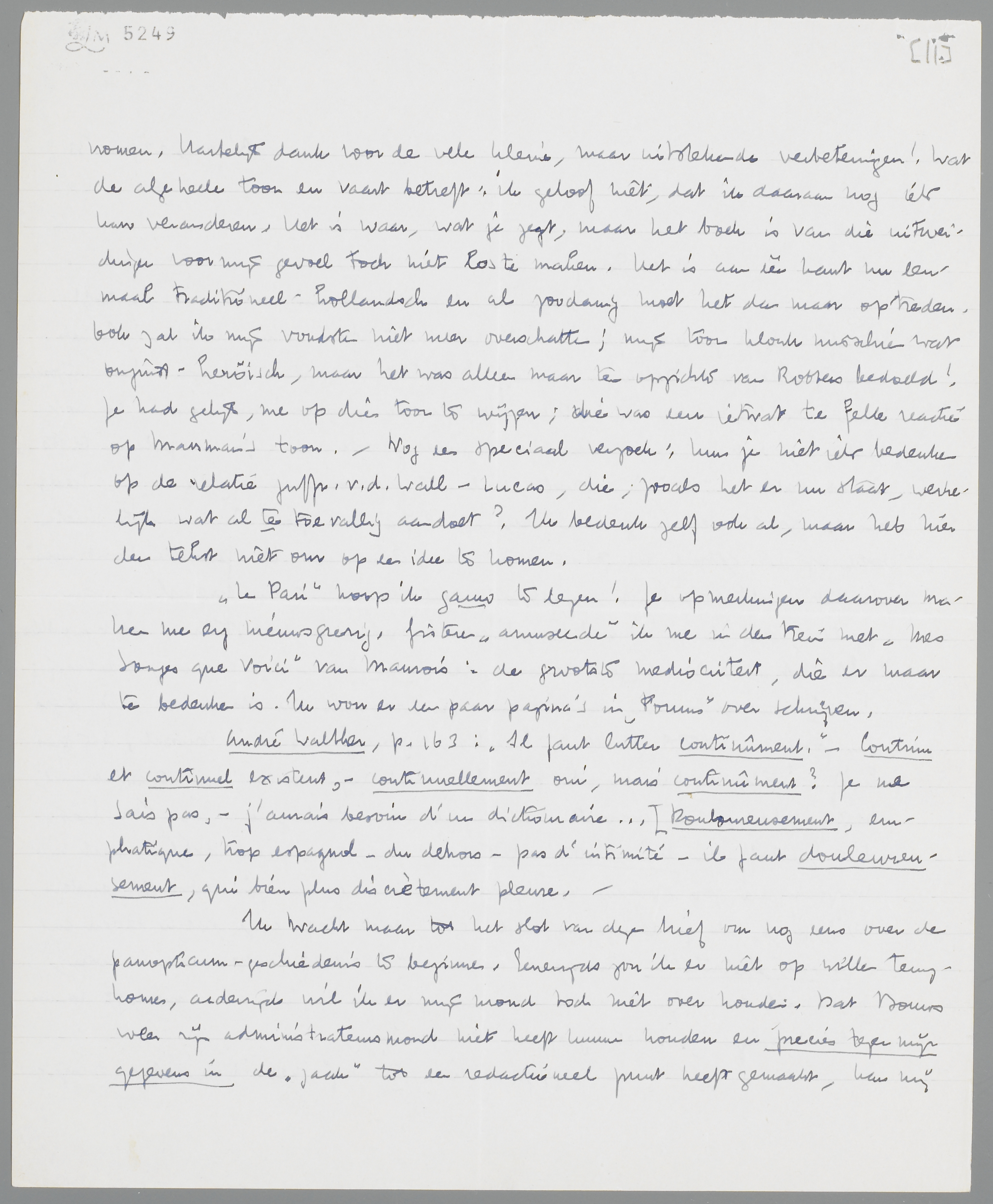 Je wijzigingen in Dumay heb ik en bloc overgenomen. Hartelijk dank voor de vele kleine, maar uitstekende verbeteringen! Wat de algehele toon en vaart betreft: ik geloof niet, dat ik daaraan nog iets kan veranderen. Het is waar, wat je zegt, maar het boek is van die uitweidingen voor mijn gevoel toch niet los te maken. Het is aan één kant nu eenmaal traditioneel-hollandsch en als zoodanig moet het dan maar optreden. Ook zal ik mijn vondsten niet meer overschatten; mijn toon klonk misschien wat onjuist-heroïsch, maar het was alleen maar ten opzichte van Robbers bedoeld! Je had gelijk, me op dien toon te wijzen; die was een ietwat te felle reactie op Marsman's toon. - Nog een speciaal verzoek: kun je niet iets bedenken op de relatie juffr. v.d. Wall-Lucas, die, zooals het er nu staat, werkelijk wat al te toevallig aandoet? Ik bedenk zelf ook al, maar heb hier den tekst niet om op een idee te komen.