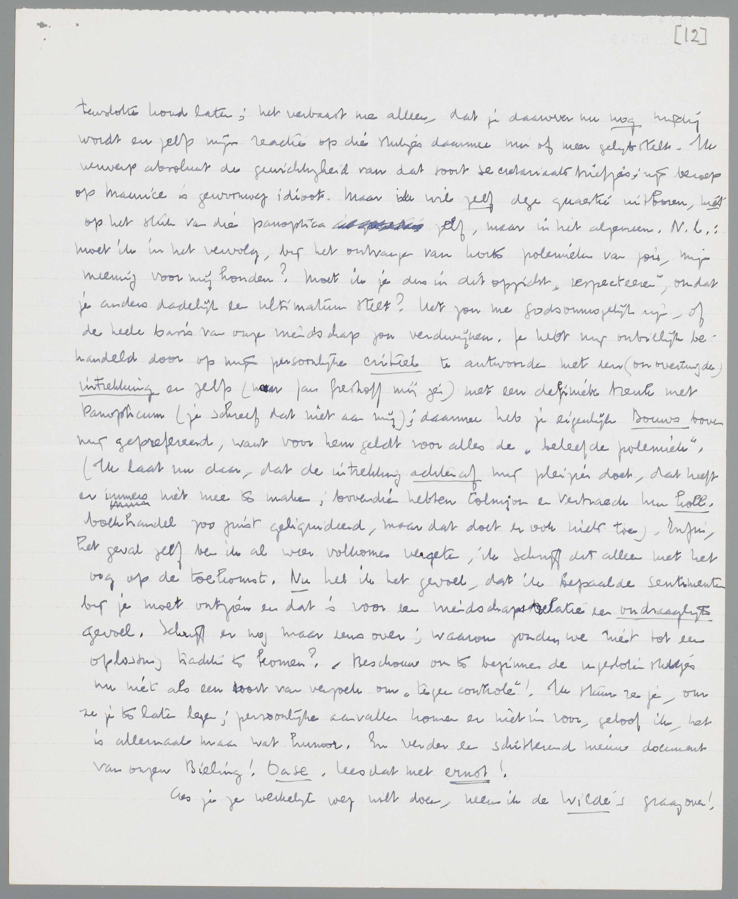Ik wacht maar tot het slot van dezen brief om nog eens over de panopticum-geschiedenis te beginnen. Eenerzijds zou ik er niet op willen terugkomen, anderzijds wil ik er mijn mond toch niet over houden. Dat Bouws weer zijn administrateursmond niet heeft kunnen houden en precies tegen mijn gegevens in de ‘zaak’ tot een redactioneel punt heeft gemaakt, kan mij tenslotte koud laten; het verbaast me alleen, dat je daarover nu nog nijdig wordt en zelfs mijn reactie op die stukjes daarmee min of meer gelijkstelt. Ik verwerp absoluut de gewichtigheid van dat soort secretariaatsbriefjes; zijn beroep op Maurice is gewoonweg idioot. Maar ik wil zelf deze quaestie uitboren, niet op het stuk van die panoptica zelf, maar in het algemeen. N.l.: moet ik in het vervolg, bij het ontvangen van korte polemieken van jou, mijn meening voor mij houden? Moet ik je dus in dit opzicht ‘respecteeren’, omdat je anders dadelijk een ultimatum stelt? Het zou me godsonmogelijk zijn, of de heele basis van onze vriendschap zou verdwijnen. Je hebt mij onbillijk behandeld door op mijn persoonlijke critiek te antwoorden met een (onovertuigde) intrekking en zelfs (naar Jan Greshoff mij zei) met een definitieve breuk met Panopticum (je schreef dat niet aan mij); daarmee heb je eigenlijk Bouws boven mij geprefereerd, want voor hem geldt voor alles de ‘beleefde polemiek’. (Ik laat nu daar, dat de intrekking achteraf mij pleizier doet, dat heeft er immers niet mee te maken; bovendien hebben Colmjon en Verbraeck hun holl. boekhandel zoo juist geliquideerd, maar dat doet er ook niets toe). Enfin, het geval zelf ben ik al weer volkomen vergeten; ik schrijf dit alleen met het oog op de toekomst. Nu heb ik het gevoel, dat ik bepaalde sentimenten bij je moet ontzien en dat is voor een vriendschapsrelatie een ondraaglijk gevoel. Schrijf er nog maar eens over; waarom zouden we niet tot een oplossing trachten te komen? - Beschouw om te beginnen de ingesloten stukjes nu niet als een soort verzoek om ‘tegen-controle’! Ik stuur ze je, om ze je te laten lezen; persoonlijke aanvallen komen er niet in voor, geloof ik, het is allemaal maar wat humor. En verder een schitterend nieuw document van onzen Bieling! Oase. Lees dat met ernst!