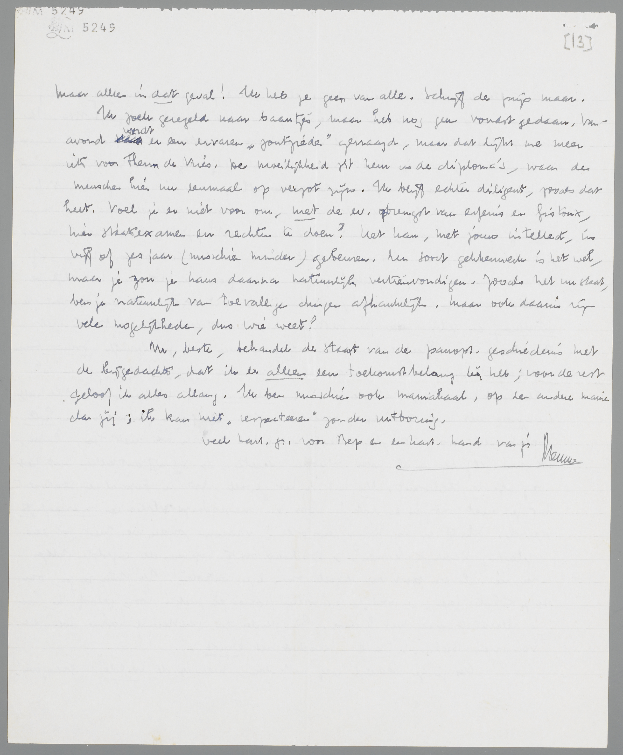 Nu, beste, behandel de staart van de panopt. geschiedenis met de bijgedachte, dat ik er alleen een toekomstbelang bij heb; voor de rest geloof ik alles allang. Ik ben misschien ook maniakaal, op een andere manier dan jij; ik kan niet ‘respecteeren’ zonder uitboring. Veel hart. gr. voor Bep en een hart. hand van