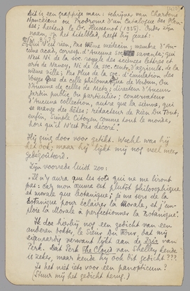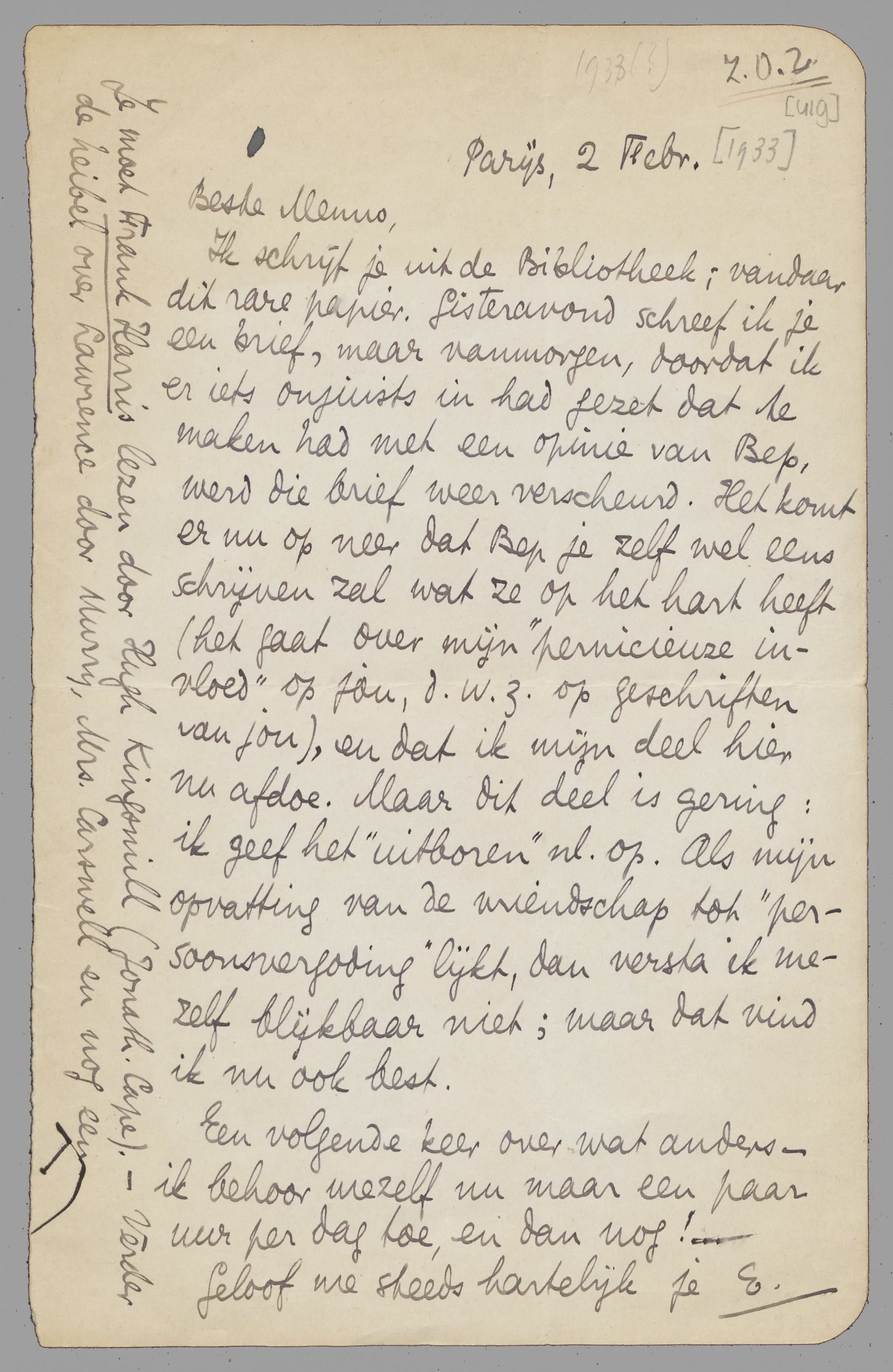 Ik schrijf je uit de Bibliotheek; vandaar dit rare papier. Gisteravond schreef ik je een brief, maar vanmorgen, doordat ik er iets onjuists in had gezet dat te maken had met een opinie van Bep, werd die brief weer verscheurd. Het komt er nu op neer dat Bep je zelf wel eens schrijven zal wat ze op het hart heeft (het gaat over mijn ‘pernicieuze invloed’ op jou, d.w.z. op geschriften van jou), en dat ik mijn deel hier nu afdoe. Maar dit deel is gering: ik geef het ‘uitboren’ nl. op. Als mijn opvatting van de vriendschap tot ‘persoonsvergoding’ leidt, dan versta ik mezelf blijkbaar niet; maar dat vind ik nu ook best.