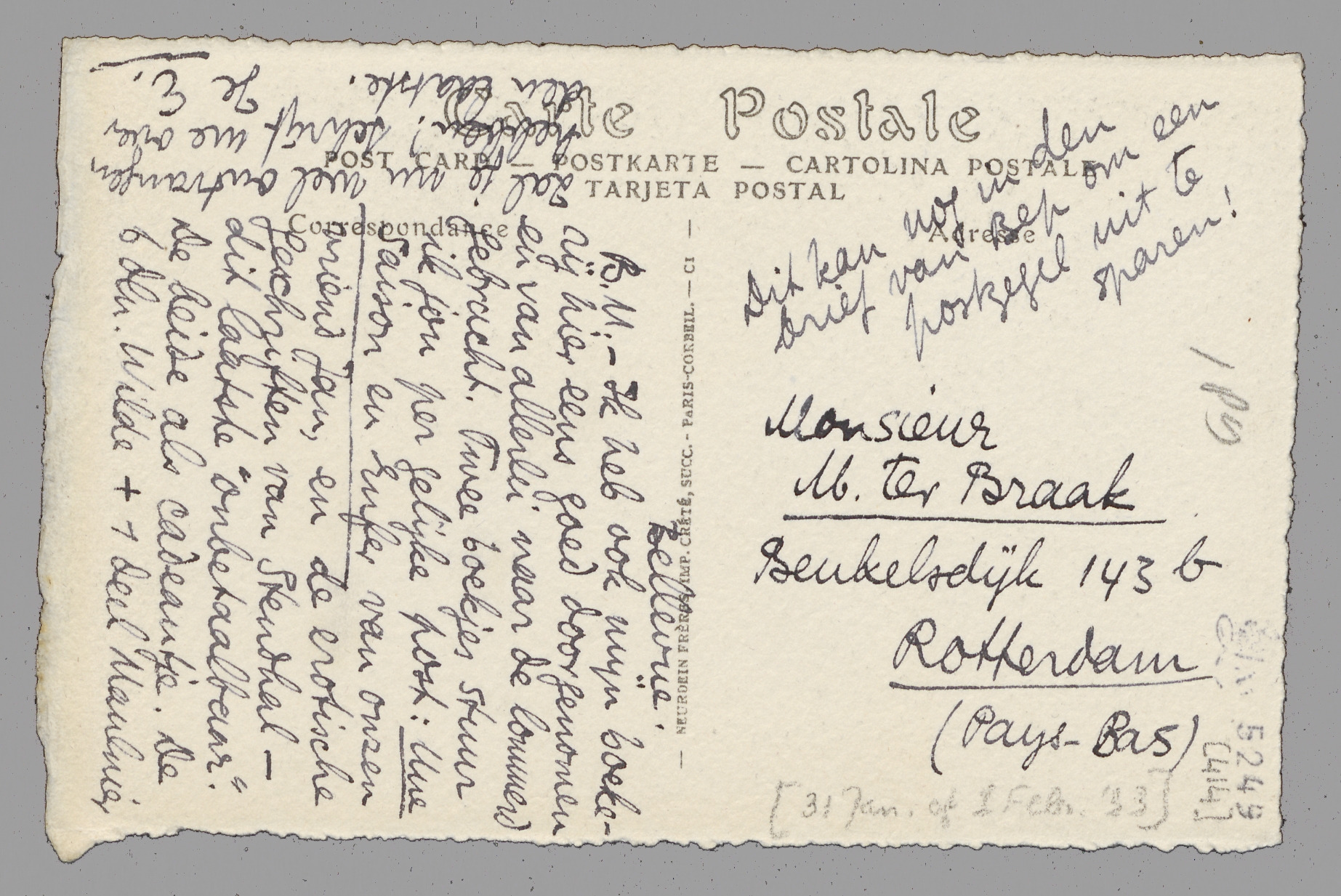 - Ik heb ook mijn boekerij hier eens goed doorgenomen en van allerlei naar de lommerd gebracht. Twee boekjes stuur ik jou per gelijke post: Une Saison en Enfer van onzen vriend Jan, en de erotische geschriften van Stendhal - dit laatste ‘onbetaalbaar’. De beide als cadeautjes. De 6 dln. Wilde + 1 deel Maulnier zal je nu wel ontvangen hebben! Schrijf me over den laatste.
