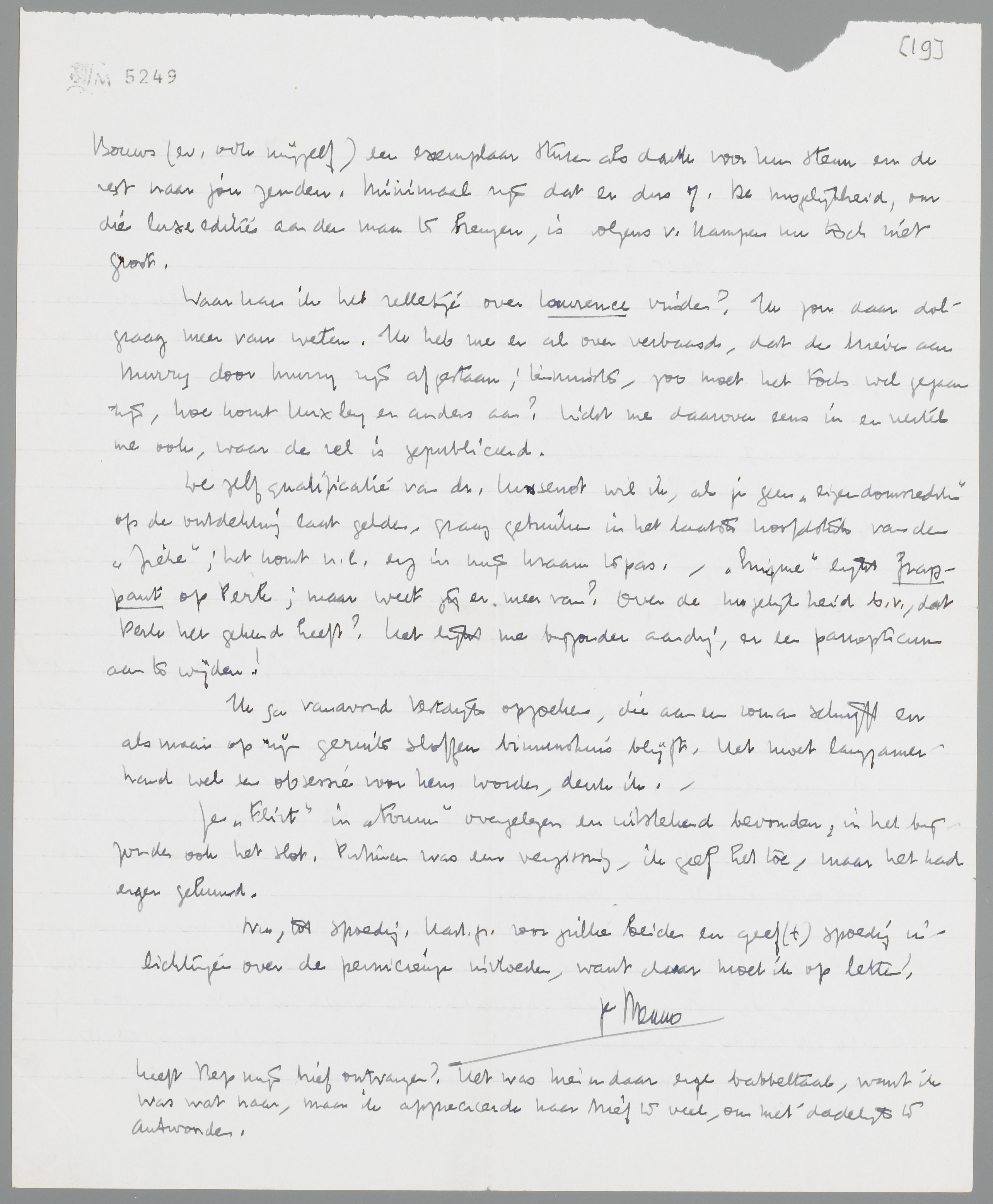 De zelfqualificatie van dr. Hussenot wil ik, als je geen ‘eigendomsrechten’ op de ontdekking laat gelden, graag gebruiken in het laatste hoofdstuk van den Zieke; het komt n.l. erg in mijn kraam te pas. - Enigme lijkt frappant op Perk; maar weet jij er meer van? Over de mogelijkheid b.v., dat Perk het gekend heeft? Het lijkt me bijzonder aardig, er een panopticum aan te wijden!