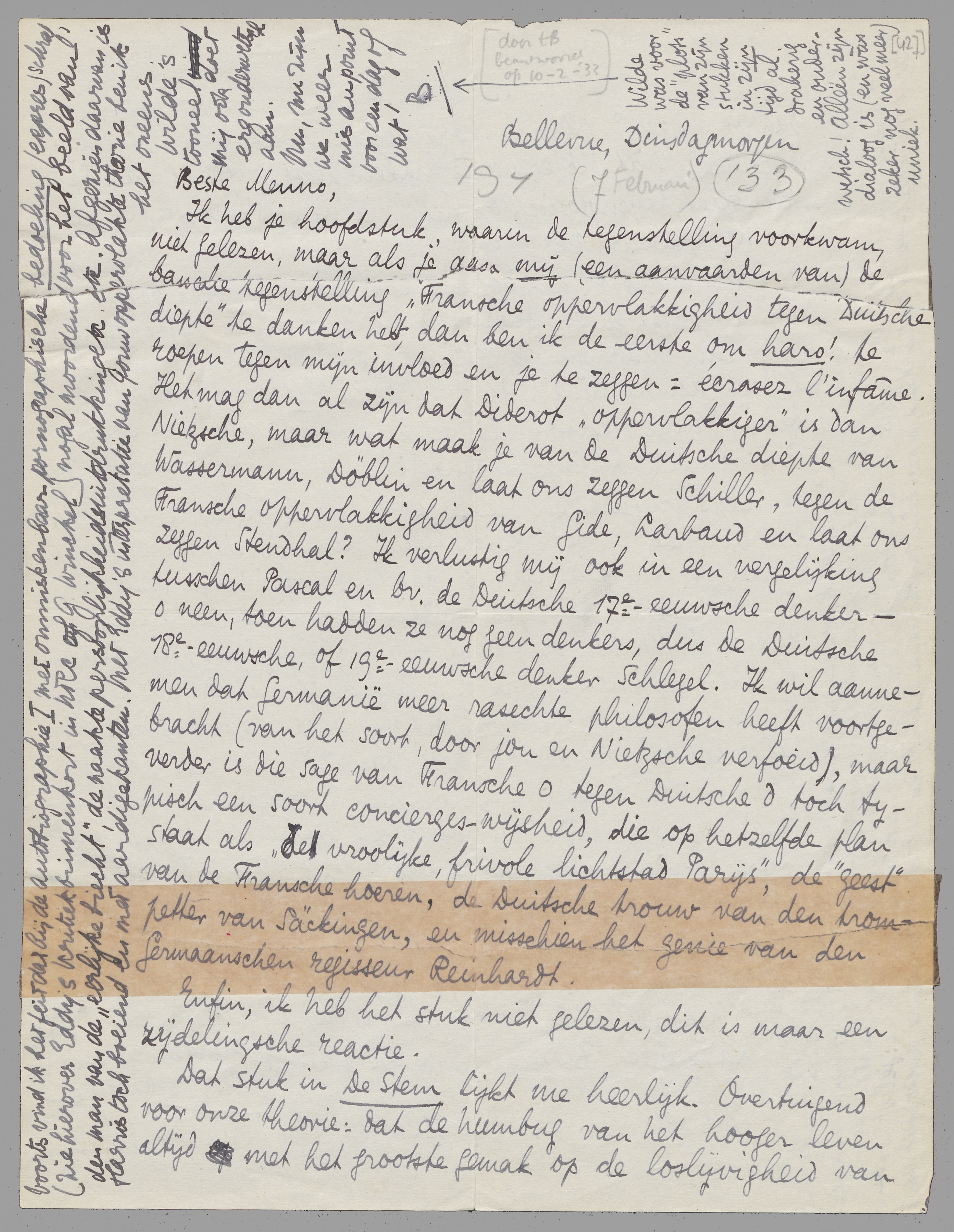 Ik heb je hoofdstuk, waarin de tegenstelling voorkwam, niet gelezen, maar als je aan mij (een aanvaarden van) de banale tegenstelling ‘Fransche oppervlakkigheid tegen Duitsche diepte’ te danken hebt, dan ben ik de eerste om haro! te roepen tegen mijn invloed en je te zeggen: écrasez l'infâme. Het mag dan al zijn dat Diderot ‘oppervlakkiger’ is dan Nietzsche, maar wat maak je van de Duitsche diepte van Wassermann, Döblin en laat ons zeggen Schiller, tegen de Fransche oppervlakkigheid van Gide, Larbaud en laat ons zeggen Stendhal? Ik verlustig mij ook in een vergelijking tusschen Pascal en bv. de Duitsche 17e eeuwsche denker - o neen, toen hadden ze nog geen denkers, dus de Duitsche 18e-eeuwsche, of 19e-eeuwsche denker Schlegel. Ik wil aannemen dat Germanië meer rasechte philosofen heeft voortgebracht (van het soort, door jou en Nietzsche verfoeid), maar verder is die sage van Fransche o tegen Duitsche d toch typisch een soort conciergeswijsheid, die op hetzelfde plan staat als ‘de vrolijke, frivole lichtstad Parijs,’ de ‘geest’ van de Fransche hoeren, de Duitsche trouw van den trompetter van Säckingen, en misschien het genie van den Germaanschen regisseur Reinhardt.