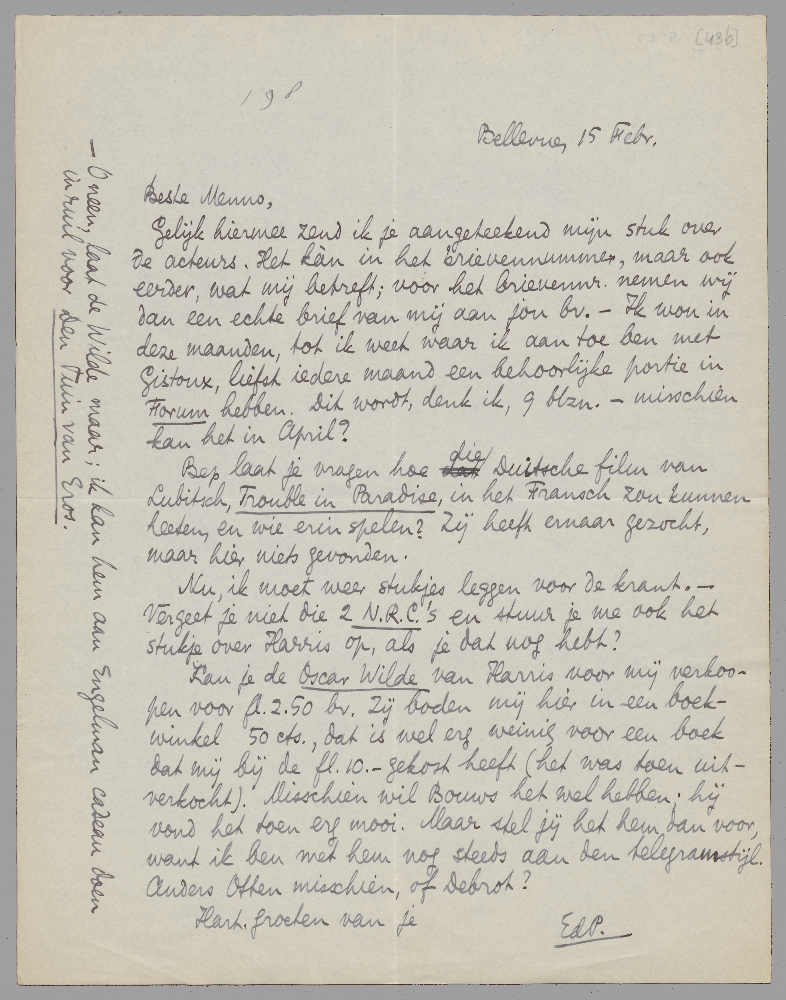 Bep laat je vragen hoe die Duitsche film van Lubitsch, Trouble in Paradise, in het Fransch zou kunnen heeten, en wie erin spelen? Zij heeft ernaar gezocht, maar hier niets gevonden.