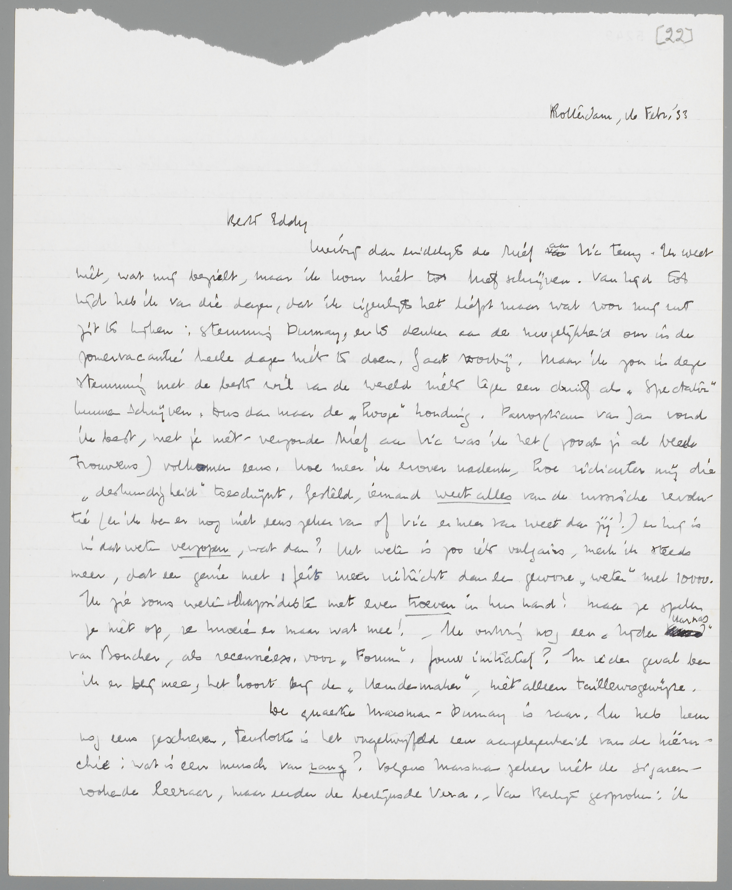 Hierbij dan eindelijk de brief aan Vic terug. Ik weet niet, wat mij bezielt, maar ik kom niet tot briefschrijven. Van tijd tot tijd heb ik van die dagen, dat ik eigenlijk het liefst maar wat voor mij uit zit te kijken; stemming Dumay, en te denken aan de mogelijkheid om in de zomervacantie heele dagen niets te doen. Gaat voorbij. Maar ik zou in deze stemming met de beste wil van de wereld niets tegen een druif als ‘Spectator’ kunnen schrijven. Dus dan maar de ‘hooge’ houding. Panopticum van Jan vond ik best, met je niet-verzonden brief aan Vic was ik het (zooals je al bleek trouwens) volkomen eens. Hoe meer ik erover nadenk, hoe ridiculer mij die ‘deskundigheid’ toeschijnt. Gesteld, iemand weet alles van de russische revolutie (en ik ben er nog niet eens zeker van of Vic er meer van weet dan jij!) en hij is in dat weten verzopen, wat dan? Het weten is zoo iets vulgairs, merk ik steeds meer, dat een genie met 1 feit meer uitricht dan een gewone ‘weter’ met 10000. Ik zie soms wetenschapsidioten met even troeven in hun hand! Maar ze spelen ze niet op, ze knoeien er maar wat mee! - Ik ontving nog een Zijden Harnas van Boucher, als recensieex. voor Forum. Jouw initiatief? In ieder geval ben ik er blij mee, het hoort bij den Hemdenmaker, niet alleen tailleursgewijze.