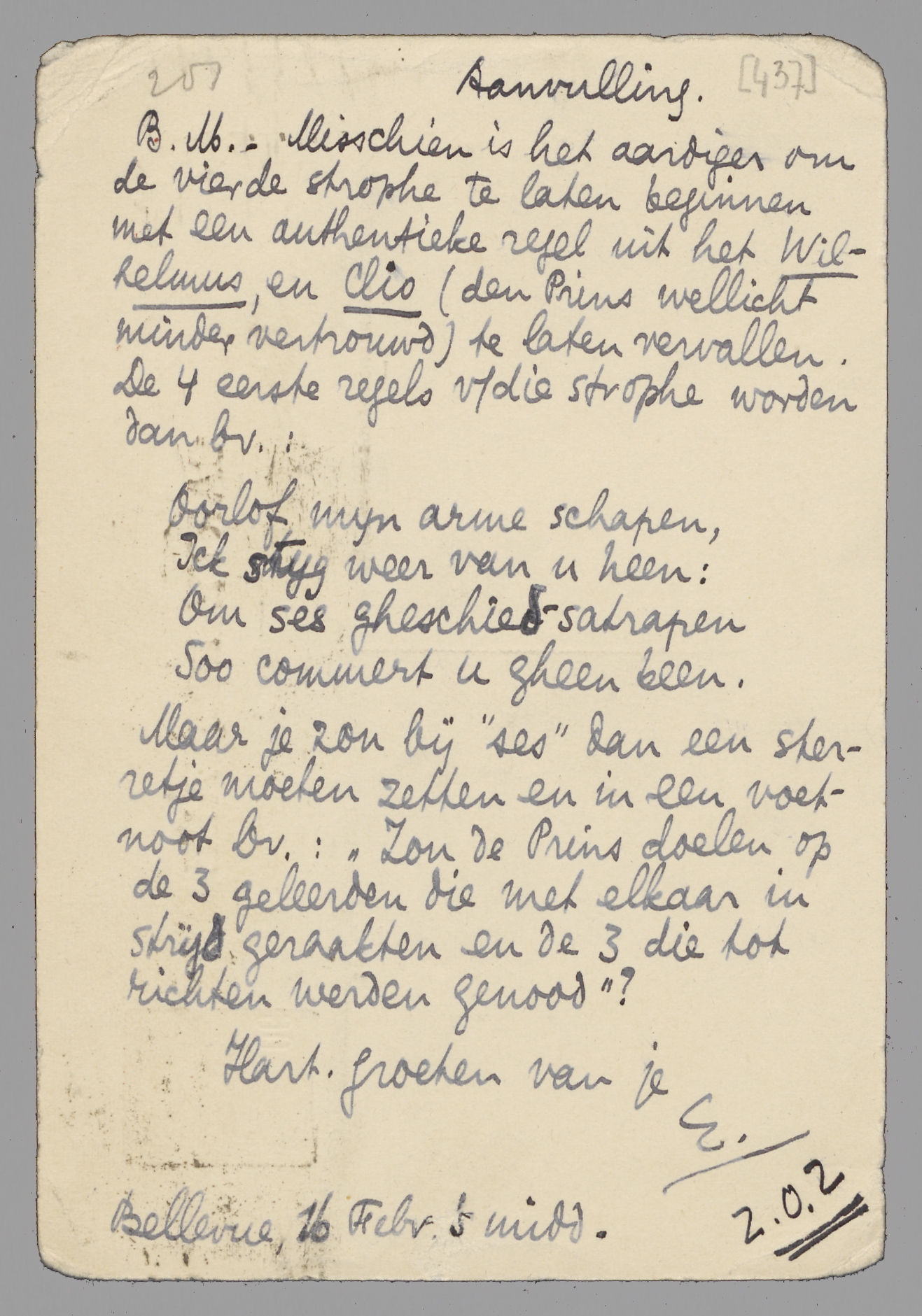 - Misschien is het aardiger om de vierde strophe te laten beginnen met een authentieke regel uit het Wilhelmus, en Clio (den Prins wellicht minder vertrouwd) te laten vervallen. De 4 eerste regels v/die strophe worden dan bv.: