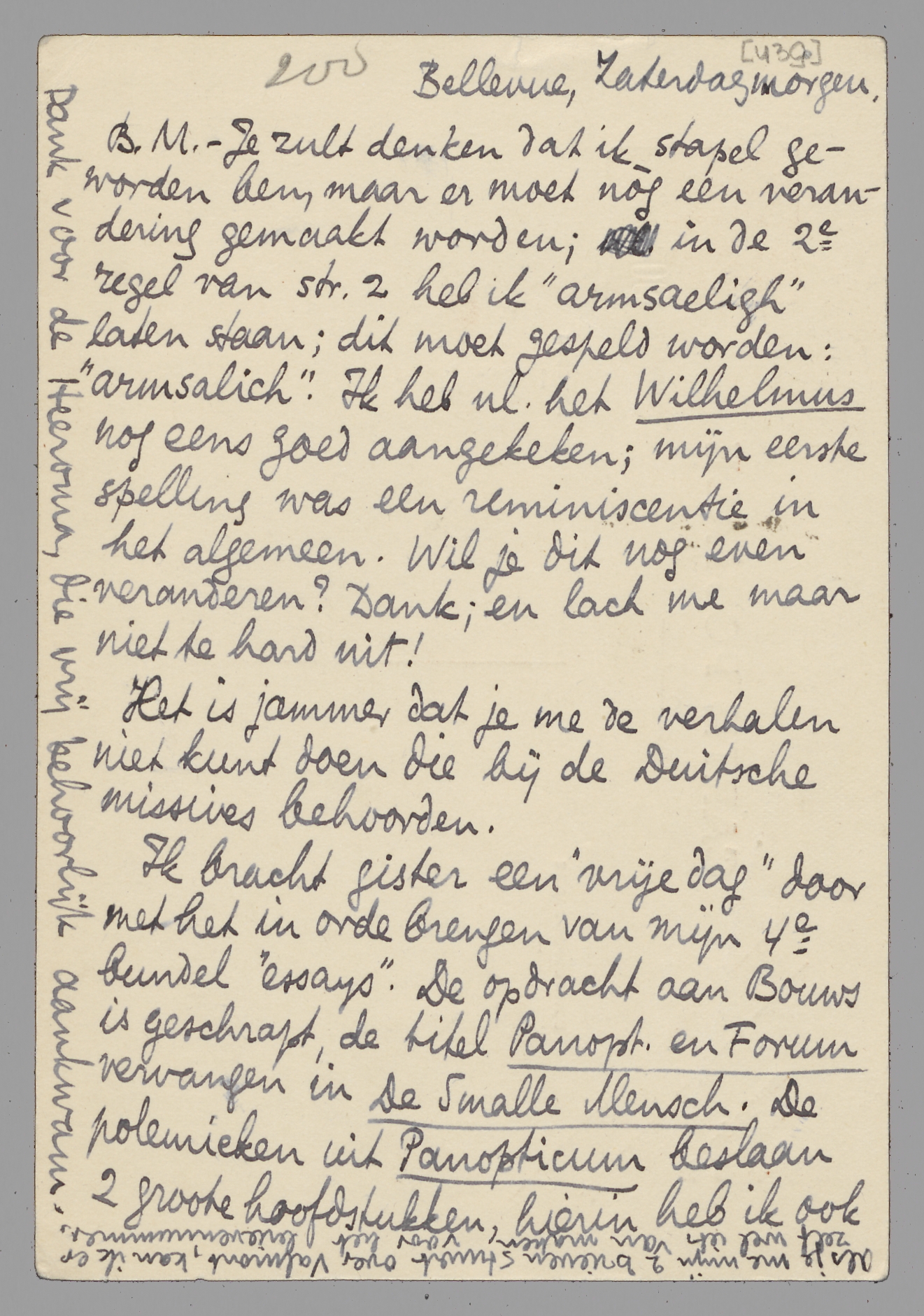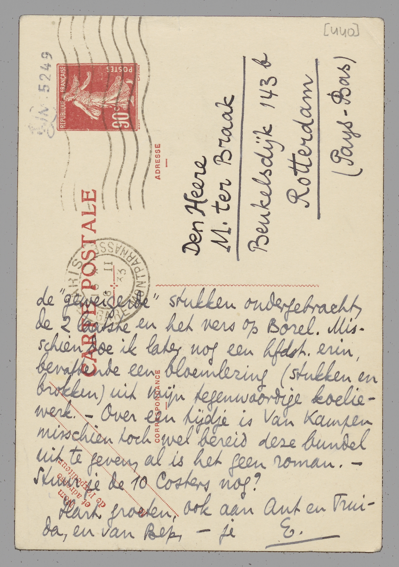 Ik bracht gister een ‘vrije dag’ door met het in orde brengen van mijn 4e bundel ‘essays’. De opdracht aan Bouws is geschrapt, de titel Panopt. en Forum vervangen in De Smalle Mensch. De polemieken uit Panopticum beslaan 2 groote hoofdstukken, hierin heb ik ook de ‘geweigerde’ stukken ondergebracht, de 2 laatste en het vers op Borel. Misschien doe ik later nog een hfdst. erin, bevattende een bloemlezing (stukken en brokken) uit mijn tegenwoordige koeliewerk. - Over een tijdje is Van Kampen misschien toch wel bereid deze bundel uit te geven, al is het geen roman. - Stuur je de 10 Costers nog?