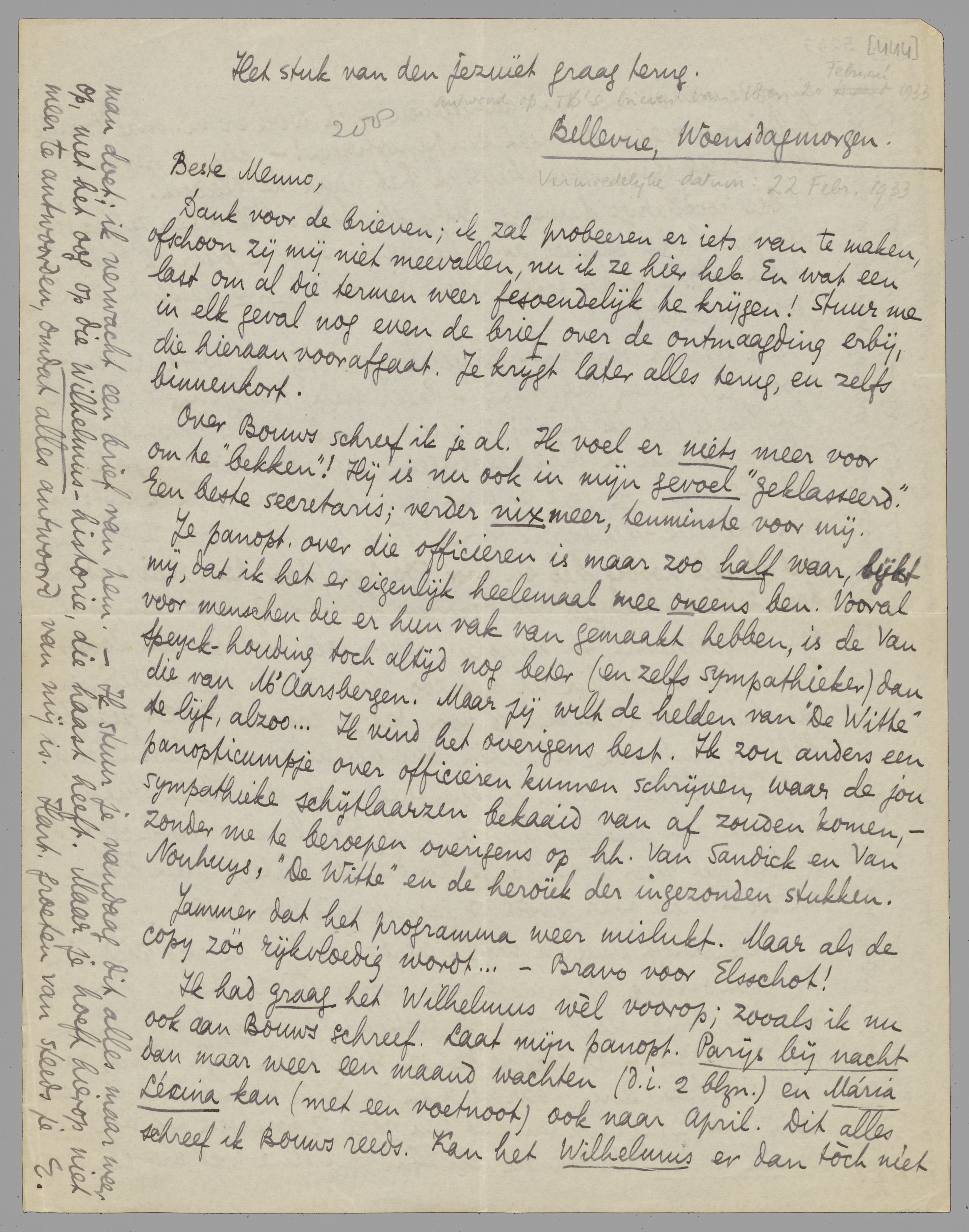 Je panopt. over die officieren is maar zoo half waar, lijkt mij, dat ik het er eigenlijk heelemaal mee oneens ben. Vooral voor menschen die er hun vak van gemaakt hebben, is de Van Speyck-houding toch altijd nog beter (en zelfs sympathieker) dan die van M'Aarsbergen. Maar jij wilt de helden van ‘De Witte’ te lijf, alzoo... Ik vind het overigens best. Ik zou anders een panopticumpje over officieren kunnen schrijven, waar de jou sympathieke schijtlaarzen bekaaid van af zouden komen, - zonder me te beroepen overigens op hh. Van Sandick en Van Nouhuys, ‘De Witte’ en de heroïek der ingezonden stukken.