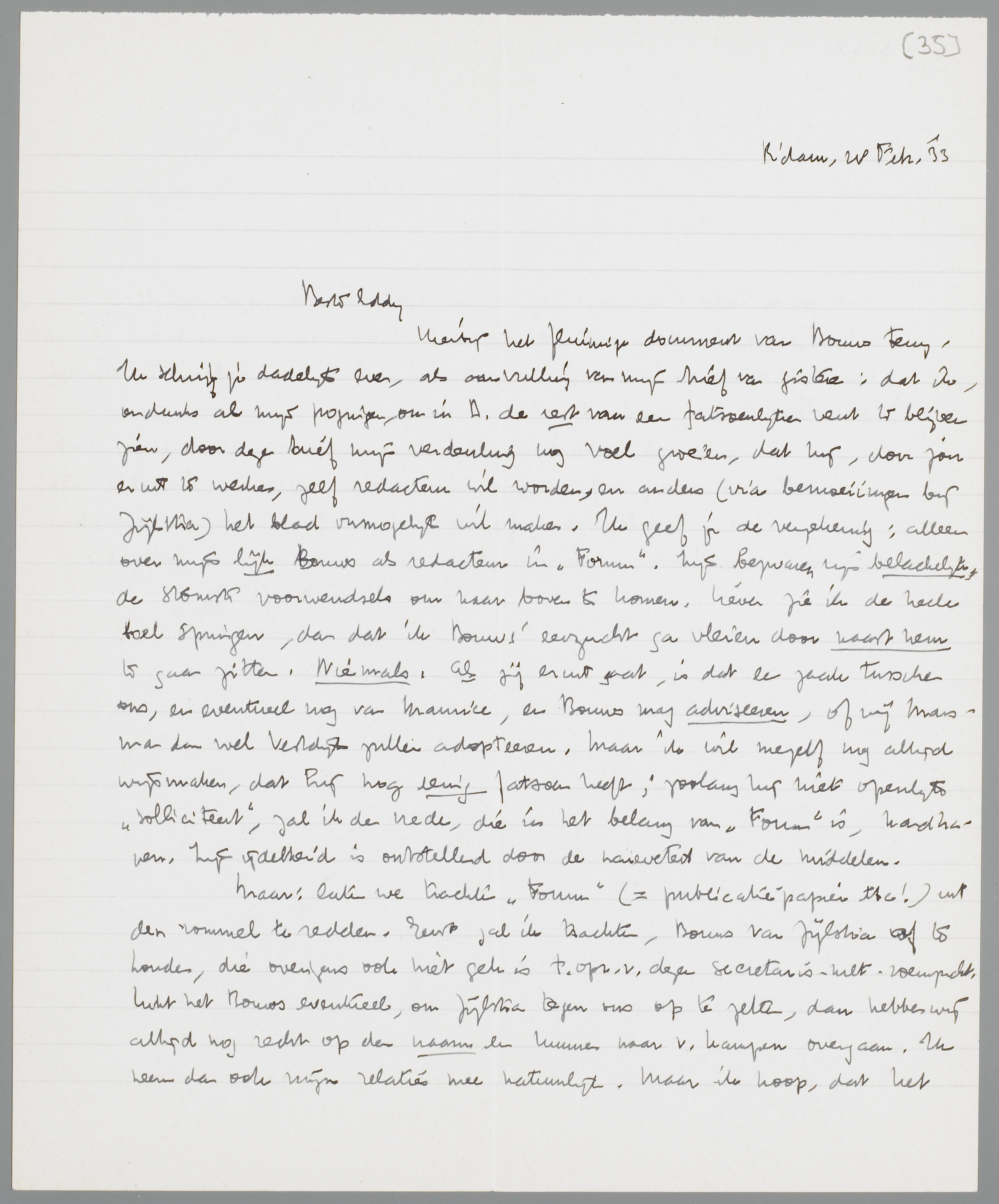 Maar: laten we trachten Forum (= publicatiepapier etc!) uit den rommel te redden. Eerst zal ik trachten, Bouws van Zijlstra af te houden, die overigens ook niet gek is t. opz. v. dezen secretaris-met-roemzucht. Lukt het Bouws eventueel, om Zijlstra tegen ons op te zetten, dan hebben wij altijd nog recht op den naam en kunnen naar v. Kampen overgaan. Ik neem dan ook mijn relaties mee natuurlijk. Maar ik hoop, dat het niet zoover hoeft te komen. Zeg in geen geval iets over deze mogelijkheid aan v. Kampen, en laat je niet nog eens door diens vriendelijke manieren bedwelmen; ook de heer v. Kampen is een zakenman en niets dan dat; ik ken die smoelementen langzamerhand wel.