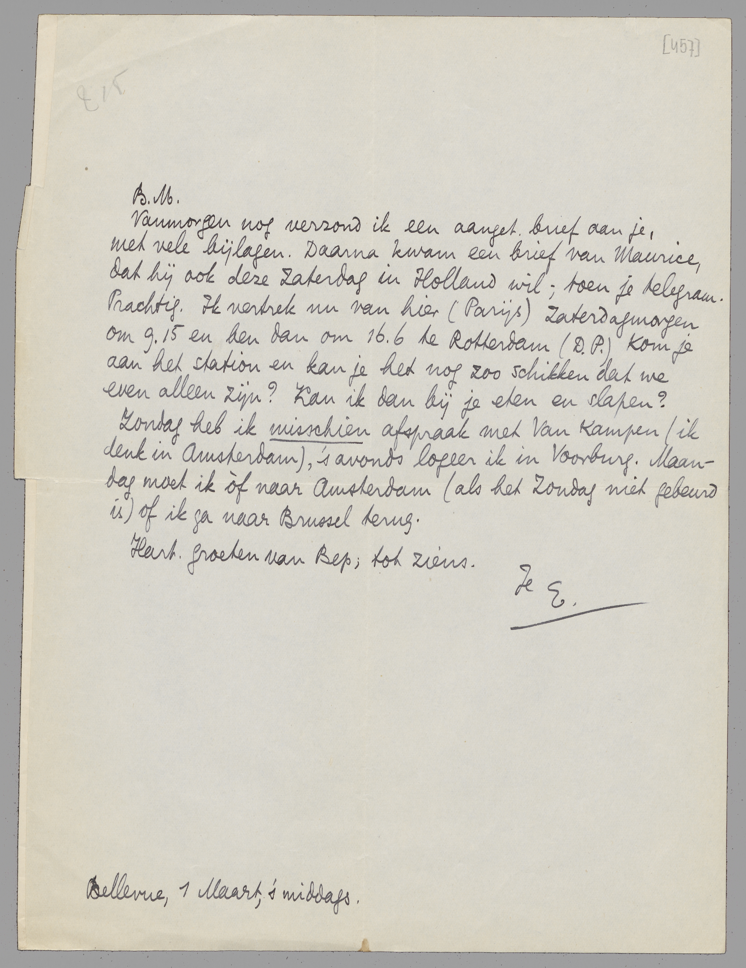 Zondag heb ik misschien afspraak met Van Kampen (ik denk in Amsterdam), 's avonds logeer ik in Voorburg. Maandag moet ik òf naar Amsterdam (als het Zondag niet gebeurd is) of ik ga naar Brussel terug. Hart. groeten van Bep; tot ziens. Je