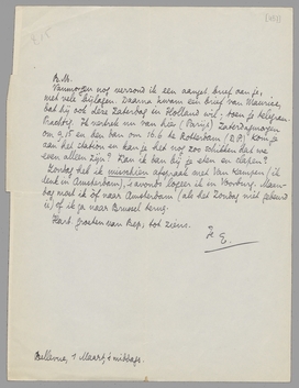 Vanmorgen nog verzond ik een aanget. brief aan je, met vele bijlagen. Daarna kwam een brief van Maurice, dat hij ook deze Zaterdag in Holland wil; toen je telegram. Prachtig. Ik vertrek nu van hier (Parijs) Zaterdagmorgen om 9.15 en ben dan om 16.6 te Rotterdam (D.P.) Kom je aan het station en kan je het nog zoo schikken dat we even alleen zijn? Kan ik dan bij je eten en slapen?