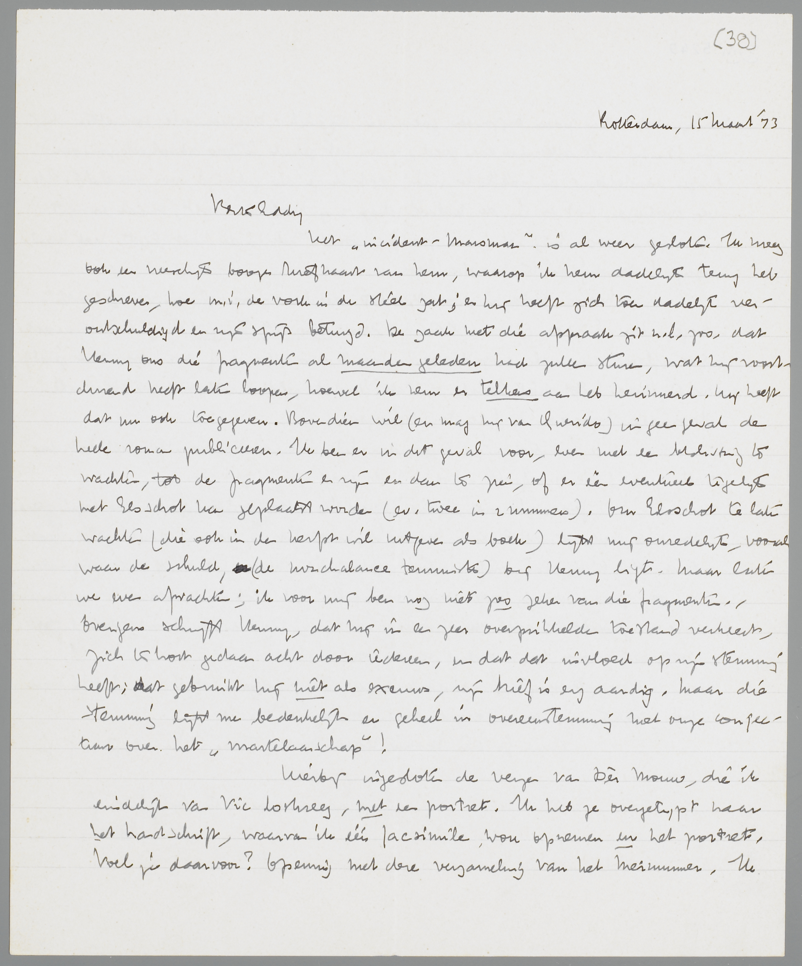 Het ‘incident-Marsman’ is al weer gesloten. Ik kreeg ook een vreeselijk booze briefkaart van hem, waarop ik hem dadelijk terug heb geschreven, hoe m.i. de vork in de steel zat; en hij heeft zich toen dadelijk verontschuldigd en zijn spijt betuigd. De zaak met die afspraak zit n.l. zoo, dat Henny ons die fragmenten al maanden geleden had zullen sturen, wat hij voortdurend heeft laten loopen, hoewel ik hem er telkens aan heb herinnerd. Hij heeft dat nu ook toegegeven. Bovendien wil (en mag hij van Querido) in geen geval de heele roman publiceeren. Ik ben er in dit geval voor, even met een beslissing te wachten, tot de fragmenten er zijn en dan te zien, of er één eventueel tegelijk met Elsschot kan geplaatst worden (ev. twee in 2 nummers). Om Elsschot te laten wachten (die ook in den herfst wil uitgeven als boek) lijkt mij onredelijk, vooral waar de schuld, (de nonchalance tenminste) bij Henny ligt. Maar laten we even afwachten; ik voor mij ben nog niet zoo zeker van die fragmenten. - Overigens schrijft Henny, dat hij in een zeer overprikkelde toestand verkeert, zich te kort gedaan acht door iedereen, en dat dat invloed op zijn stemming heeft; dat gebruikt hij niet als excuus, zijn brief is erg aardig. Maar die stemming lijkt me bedenkelijk en geheel in overeenstemming met onze conjectuur over het ‘martelaarschap’!