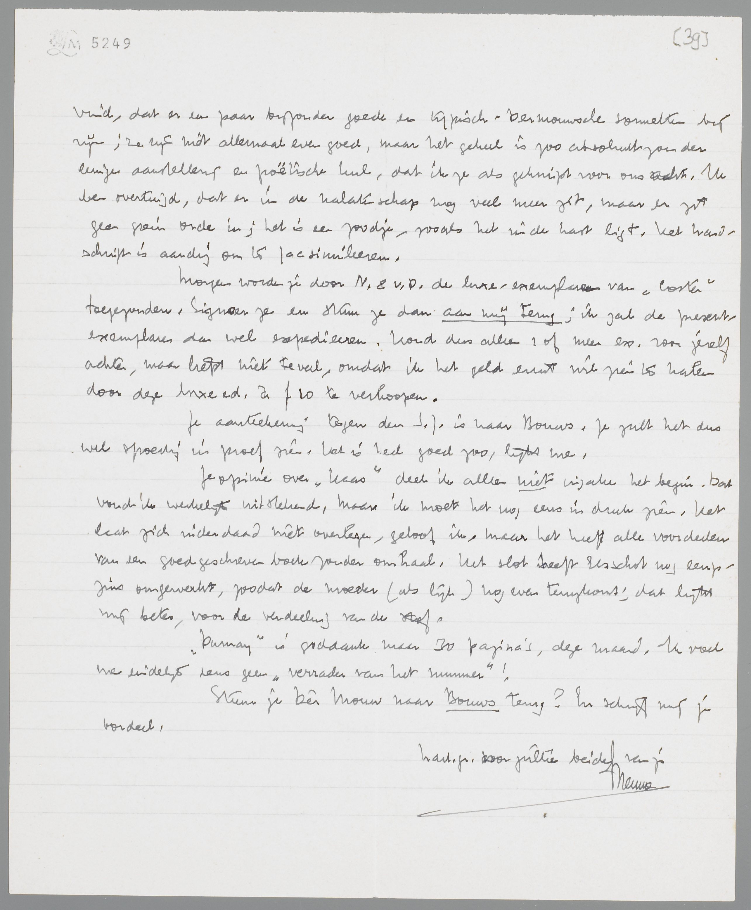 Morgen worden je door N. & v.D. de luxe-exemplaren van Coster toegezonden. Signeer ze en stuur ze dan aan mij terug; ik zal de presentexemplaren dan wel expedieëren. Houd dus alleen 2 of meer ex. voor jezelf achter, maar liefst niet te veel, omdat ik het geld eruit wil zien te halen door deze luxe ed. à ƒ 10 te verkoopen.