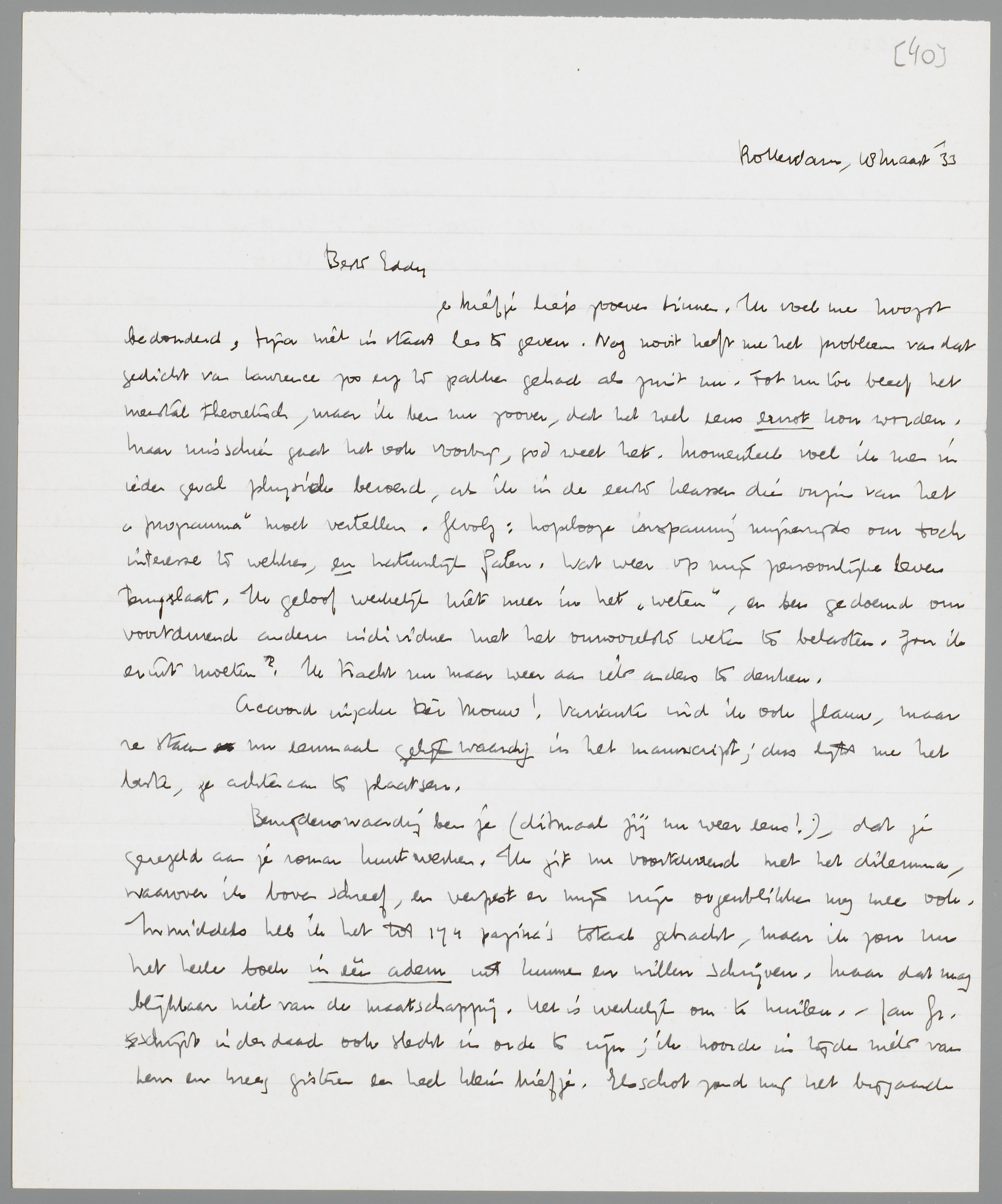 Je briefje liep zooeven binnen. Ik voel me hoogst bedonderd, bijna niet in staat les te geven. Nog nooit heeft me het probleem van dat gedicht van Lawrence zoo erg te pakken gehad als juist nu. Tot nu toe bleef het meestal theoretisch, maar ik ben nu zoover, dat het wel eens ernst kon worden. Maar misschien gaat het ook voorbij, god weet het. Momenteel voel ik me in ieder geval physiek beroerd, als ik in de eerste klassen die onzin van het ‘programma’ moet vertellen. Gevolg: hopelooze inspanning mijnerzijds om toch interesse te wekken, en natuurlijk falen. Wat weer op mijn persoonlijke leven terugslaat. Ik geloof werkelijk niet meer in het ‘weten’, en ben gedoemd om voortdurend andere individuen met het onnoozelste weten te belasten. Zou ik eruit moeten? Ik tracht nu maar weer aan iets anders te denken.