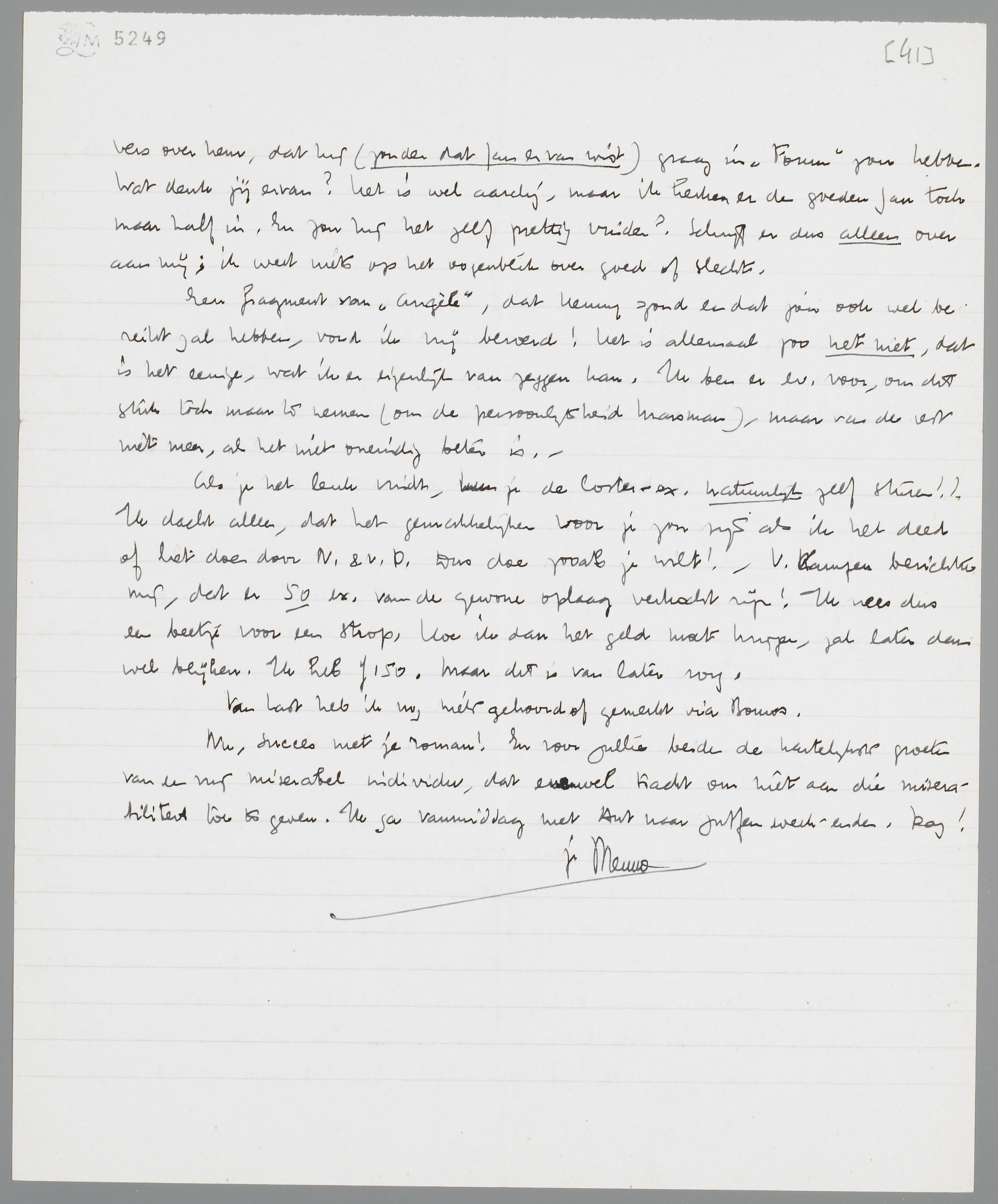 Als je het leuk vindt, kun je de Coster-ex. natuurlijk zelf sturen!! Ik dacht alleen, dat het gemakkelijker voor je zou zijn als ik het deed of liet doen door N. & v.D. Dus doe zooals je wilt! - V. Kampen berichtte mij, dat er 50 ex. van de gewone oplaag verkocht zijn! Ik vrees dus een beetje voor een strop. Hoe ik dan het geld moet krijgen, zal later dan wel blijken. Ik heb ƒ 150. Maar dit is van later zorg.