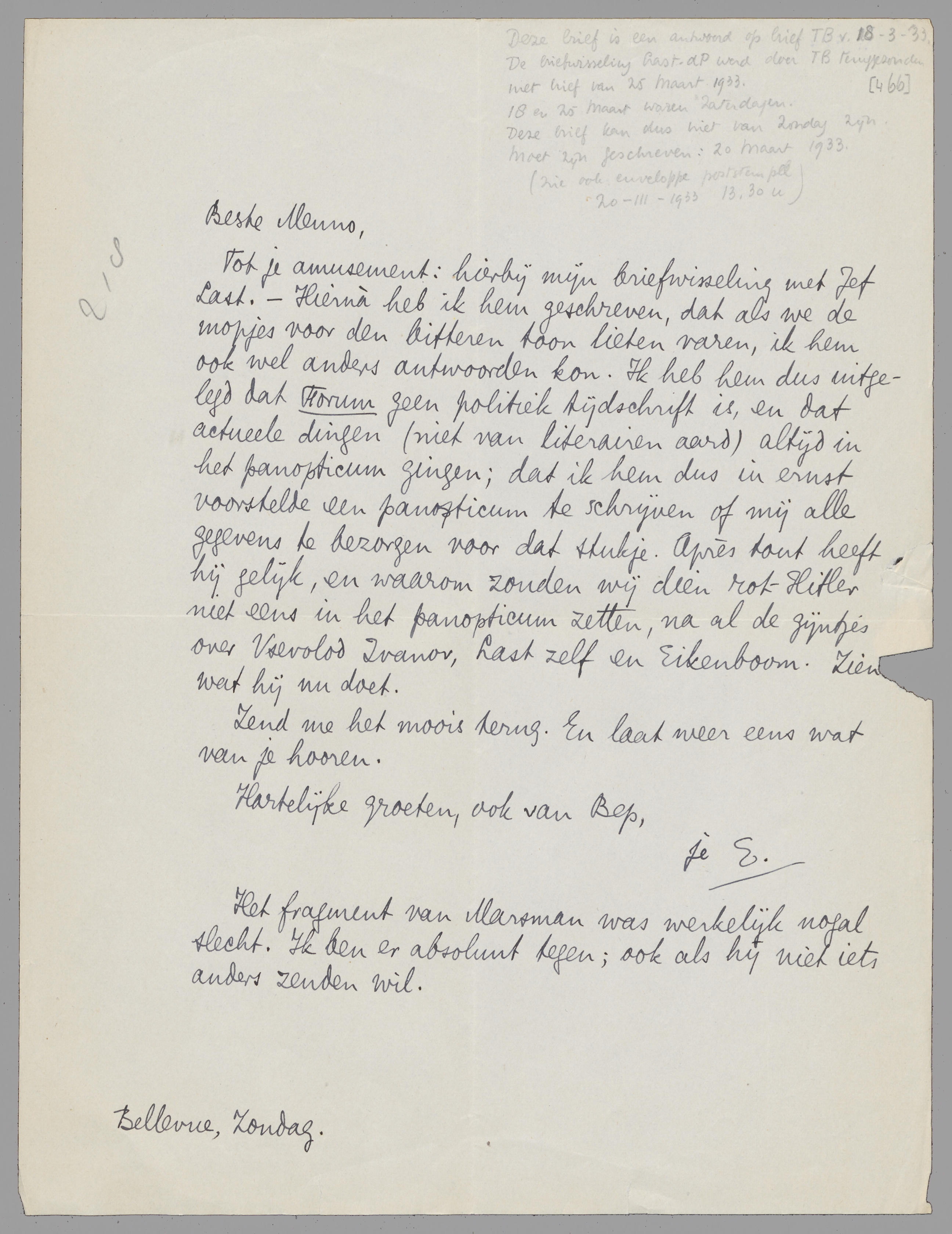 Tot je amusement: hierbij mijn briefwisseling met Jef Last. - Hiernà heb ik hem geschreven, dat als we de mopjes voor den bitteren toon lieten varen, ik hem ook wel anders antwoorden kon. Ik heb hem dus uitgelegd dat Forum geen politiek tijdschrift is, en dat actueele dingen (niet van literairen aard) altijd in het panopticum gingen; dat ik hem dus in ernst voorstelde een panopticum te schrijven of mij alle gegevens te bezorgen voor dat stukje. Après tout heeft hij gelijk, en waarom zouden wij dien rot-Hitler niet eens in het panopticum zetten, na al de gijntjes over Vsevolod Ivanov, Last zelf en Eikenboom. Zien wat hij nu doet.