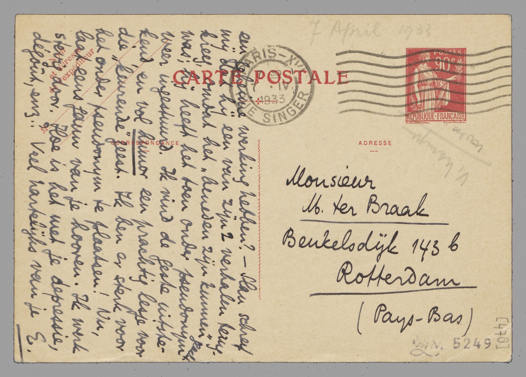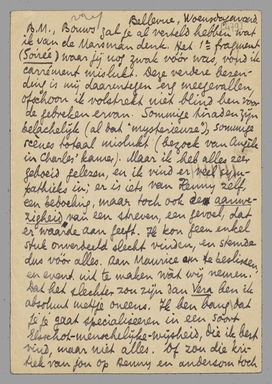 Bouws zal je al verteld hebben wat ik van de Marsman denk. Het 1e fragment (Soireè) waar jij nog zwak vóór was, vond ik carrément mislukt. Deze verdere bezending is mij daarentegen erg meegevallen, ofschoon ik volstrekt niet blind ben voor de gebreken ervan. Sommige tiraden zijn belachelijk (al dat ‘mysterieuze’), sommige scènes totaal mislukt (bezoek van Angèle in Charles' kamer). Maar ik heb alles zeer geboeid gelezen, en ik vind er veel sympathieks in; er is iets van Henny zelf, een bedoeling, maar toch ook de aanwezigheid van een streven, een gevoel, dat er waarde aan geeft. Ik kon geen enkel stuk onverdeeld slecht vinden, en stemde dus vóór alles. Aan Maurice om te beslissen, en event. uit te maken wàt wij nemen. Dat het slechter zou zijn dan Vera ben ik absoluut met je oneens. Ik ben bang dat je je gaat specialiseeren in een soort Elsschot-menschelijke-wijsheid, die ik best vind, maar niet alles. Of zou die kritiek van jou op Henny en andersom toch een geheime werking hebben? - Slau schreef mij dat hij een van zijn 2 verhalen terugkreeg, omdat het ‘beneden zijn kunnen’ geacht was; hij heeft het toen onder pseudonym weer ingestuurd. Ik vind de geste uitstekend, en vol humor, een prachtig lesje voor die ‘keurende’ geest. Ik ben er sterk voor het onder pseudonym te plaatsen! Nu, laat eens gauw van je hooren. Ik werk stevig door. Hoe is het met je depressie, dégoût, enz.? Veel hartelijks van je