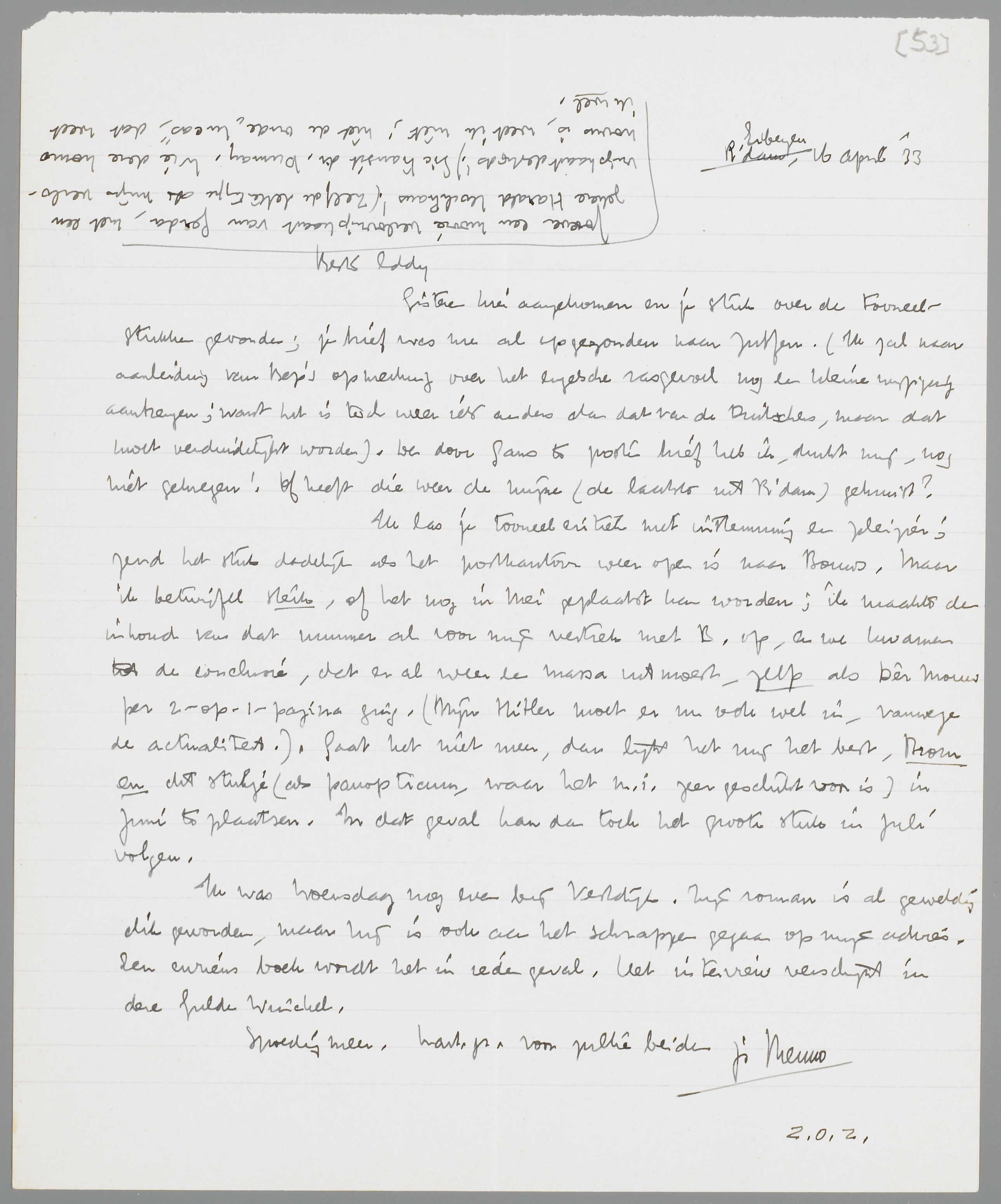 Ik las je tooneelcritiek met instemming en pleizier; zend het stuk dadelijk als het postkantoor weer open is naar Bouws. Maar ik betwijfel sterk, of het nog in Mei geplaatst kan worden; ik maakte de inhoud van dat nummer al voor mijn vertrek met B. op, en we kwamen tot de conclusie, dat er al weer een massa uit moest, zelfs als Dèr Mouw per 2-op-1-pagina ging. (Mijn Hitler moet er nu ook wel in, vanwege de actualiteit.) Gaat het niet meer, dan lijkt het mij het best, Brom en dit stukje (als panopticum, waar het m.i. zeer geschikt voor is) in Juni te plaatsen. In dat geval kan dan toch het groote stuk in Juli volgen.