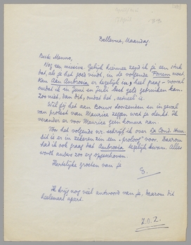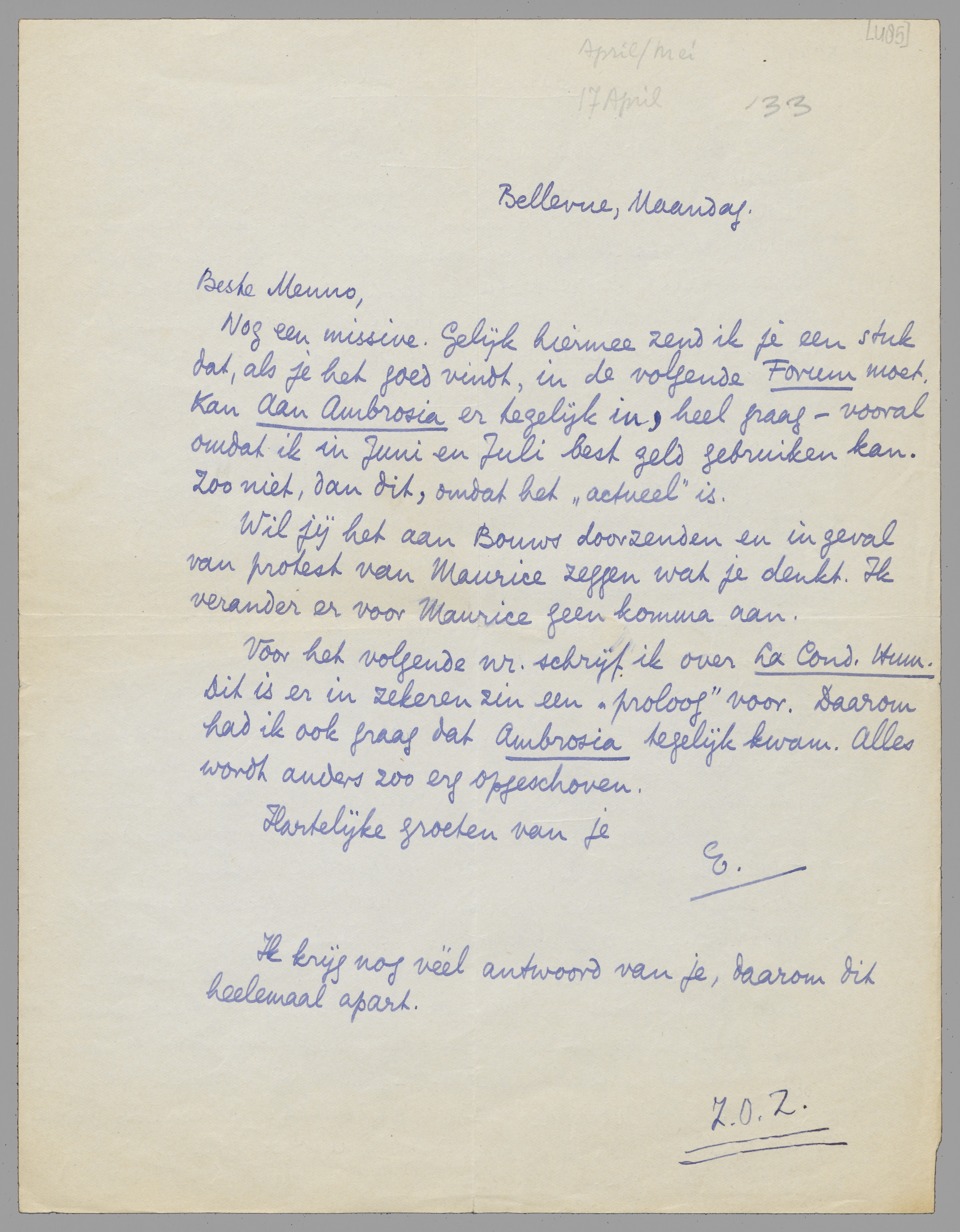 Nog een missive. Gelijk hiermee zend ik je een stuk dat, als je het goed vindt, in de volgende Forum moet. Kan Aan Ambrosia er tegelijk in, heel graag - vooral omdat ik in Juni en Juli best geld gebruiken kan. Zoo niet, dan dit, omdat het ‘actueel’ is. Wil jij het aan Bouws doorzenden en in geval van protest van Maurice zeggen wat je denkt. Ik verander er voor Maurice geen komma aan.