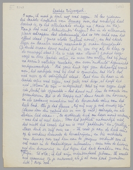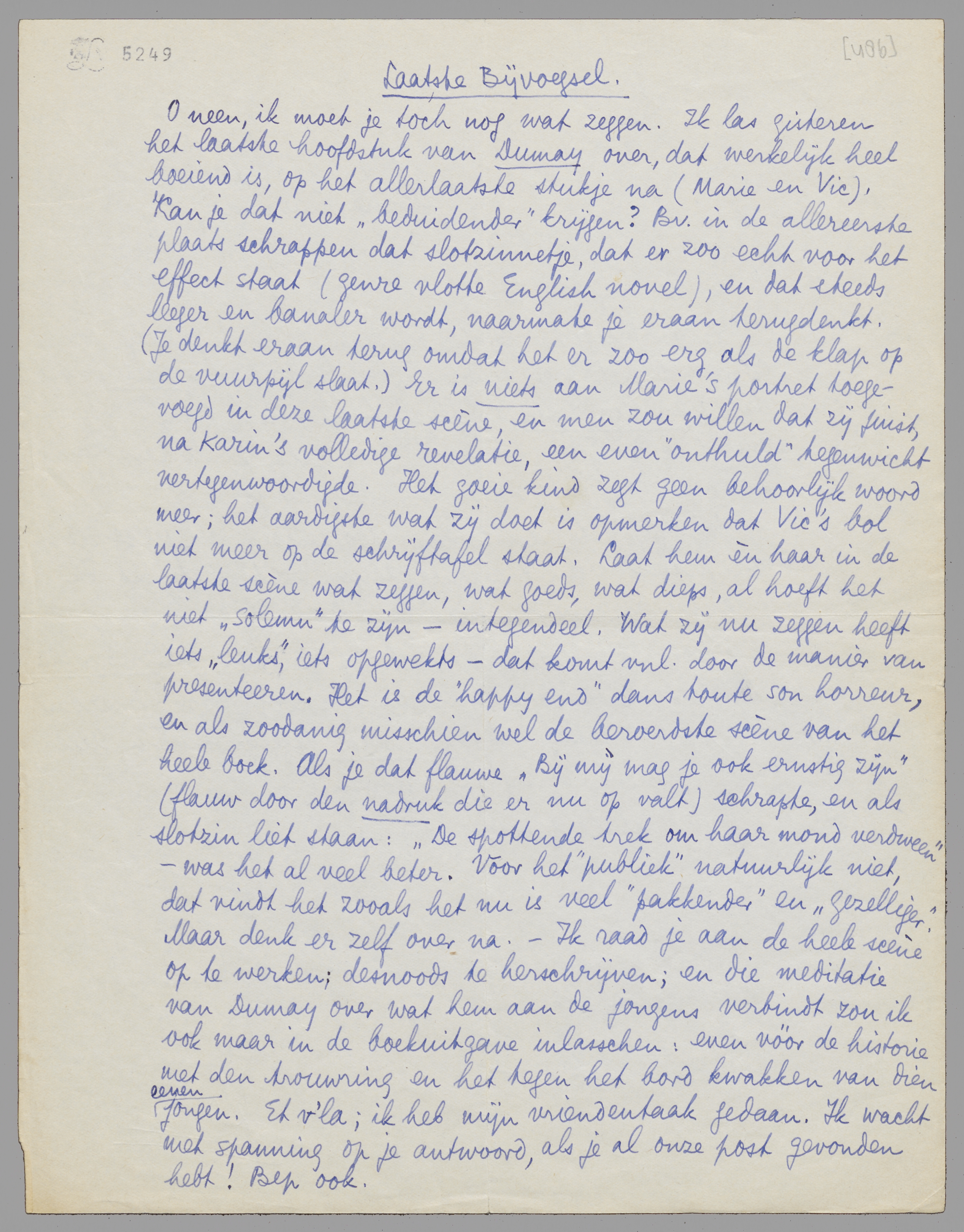 O neen, ik moet je toch nog wat zeggen. Ik las gisteren het laatste hoofdstuk van Dumay over, dat werkelijk heel boeiend is, op het allerlaatste stukje na (Marie en Vic). Kan je dat niet ‘beduidender’ krijgen? Bv. in de allereerste plaats schrappen dat slotzinnetje, dat er zoo echt voor het effect staat (genre vlotte English novel), en dat steeds leger en banaler wordt, naarmate je eraan terugdenkt. (Je denkt eraan terug omdat het er zoo erg als de klap op de vuurpijl slaat.) Er is niets aan Marie's portret toegevoegd in deze laatste scène, en men zou willen dat zij juist, na Karin's volledige revelatie, een even ‘onthuld’ tegenwicht vertegenwoordigde. Het goeie kind zegt geen behoorlijk woord meer; het aardigste wat zij doet is opmerken dat Vic's bol niet meer op de schrijftafel staat. Laat hem èn haar in de laatste scène wat zeggen, wat goeds, wat dieps, al hoeft het niet ‘solemn’ te zijn - integendeel. Wat zij nu zeggen heeft iets ‘leuks’, iets opgewekts - dat komt vnl. door de manier van presenteeren. Het is de ‘happy end’ dans toute son horreur, en als zoodanig misschien wel de beroerdste scène van het heele boek. Als je dat flauwe ‘Bij míj mag je ook ernstig zijn’ (flauw door den nadruk die er nu op valt) schrapte, en als slotzin liet staan: ‘De spottende trek om haar mond verdween’ - was het al veel beter. Voor het ‘publiek’ natuurlijk niet, dat vindt het zooals het nu is veel ‘pakkender’ en ‘gezelliger’. Maar denk er zelf over na. - Ik raad je aan de heele scène op te werken; desnoods te herschrijven; en die meditatie van Dumay over wat hem aan de jongens verbindt zou ik ook maar in de boekuitgave inlasschen: even vóór de historie met den trouwring en het tegen het bord kwakken van dien eenen jongen. Et v'la; ik heb mijn vriendentaak gedaan. Ik wacht met spanning op je antwoord, als je al onze post gevonden hebt! Bep ook.