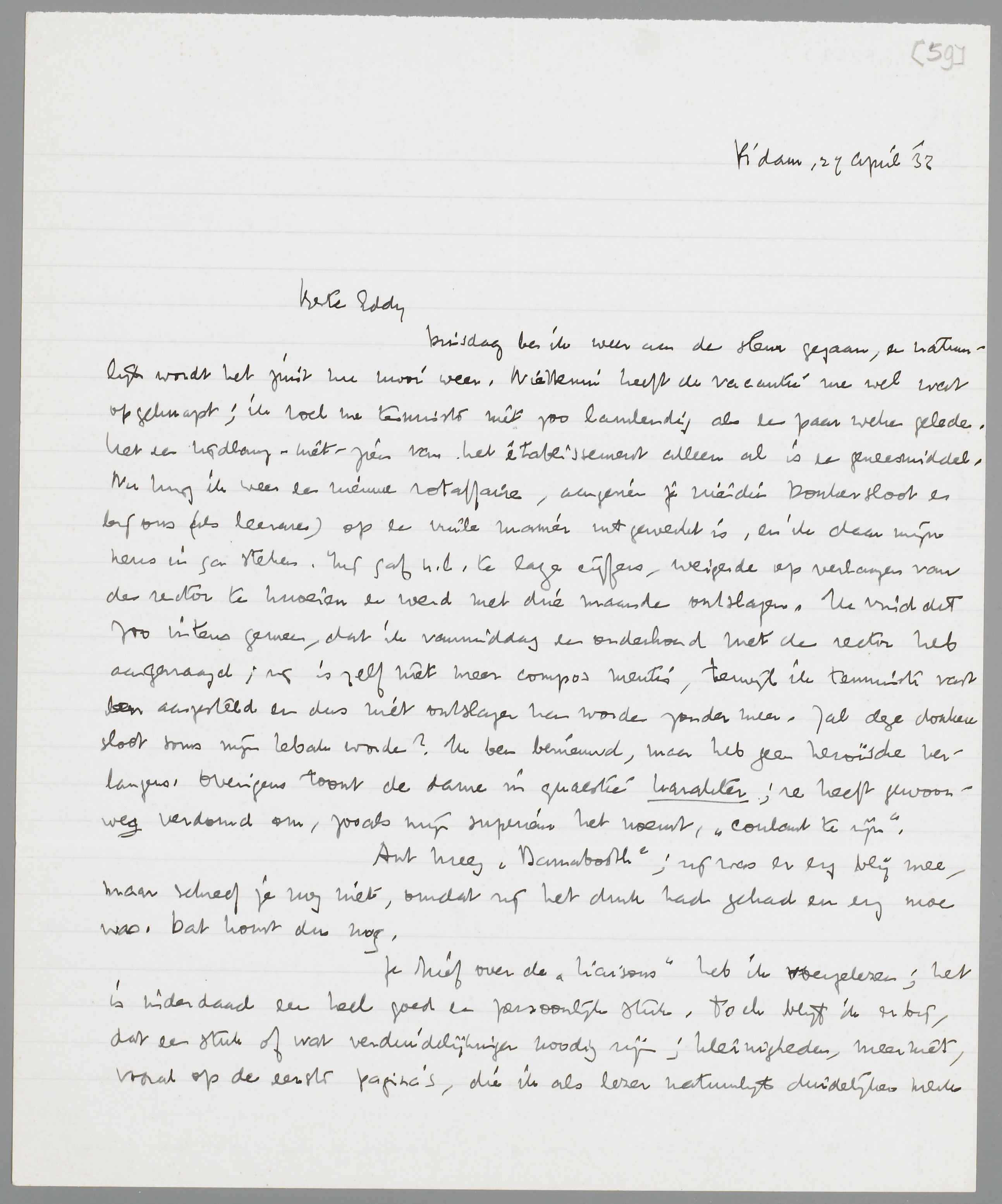 Dinsdag ben ik weer aan de sleur gegaan, en natuurlijk wordt het juist nu mooi weer. Niettemin heeft de vacantie me wel wat opgeknapt; ik voel me tenminste niet zoo lamlendig als een paar weken geleden. Het een tijdlang-niet-zien van het établissement alleen al is een geneesmiddel. Nu krijg ik weer een nieuwe rotaffaire, aangezien je vriendin Donkersloot er bij ons (als leerares) op een vuile manier uitgewerkt is, en ik daar mijn neus in ga steken. Zij gaf n.l. te lage cijfers, weigerde op verlangen van den rector te knoeien en werd met drie maanden ontslagen. Ik vind dit zoo intens gemeen, dat ik vanmiddag een onderhoud met den rector heb aangevraagd; zij is zelf niet meer compos mentis, terwijl ik tenminste vast ben aangesteld en dus niet ontslagen kan worden zonder meer. Zal deze donkere sloot soms mijn lebak worden? Ik ben benieuwd, maar heb geen heroïsche verlangens. Overigens toont de dame in quaestie karakter; ze heeft gewoonweg verdomd om, zooals mijn superieur het noemt, ‘coulant te zijn’.